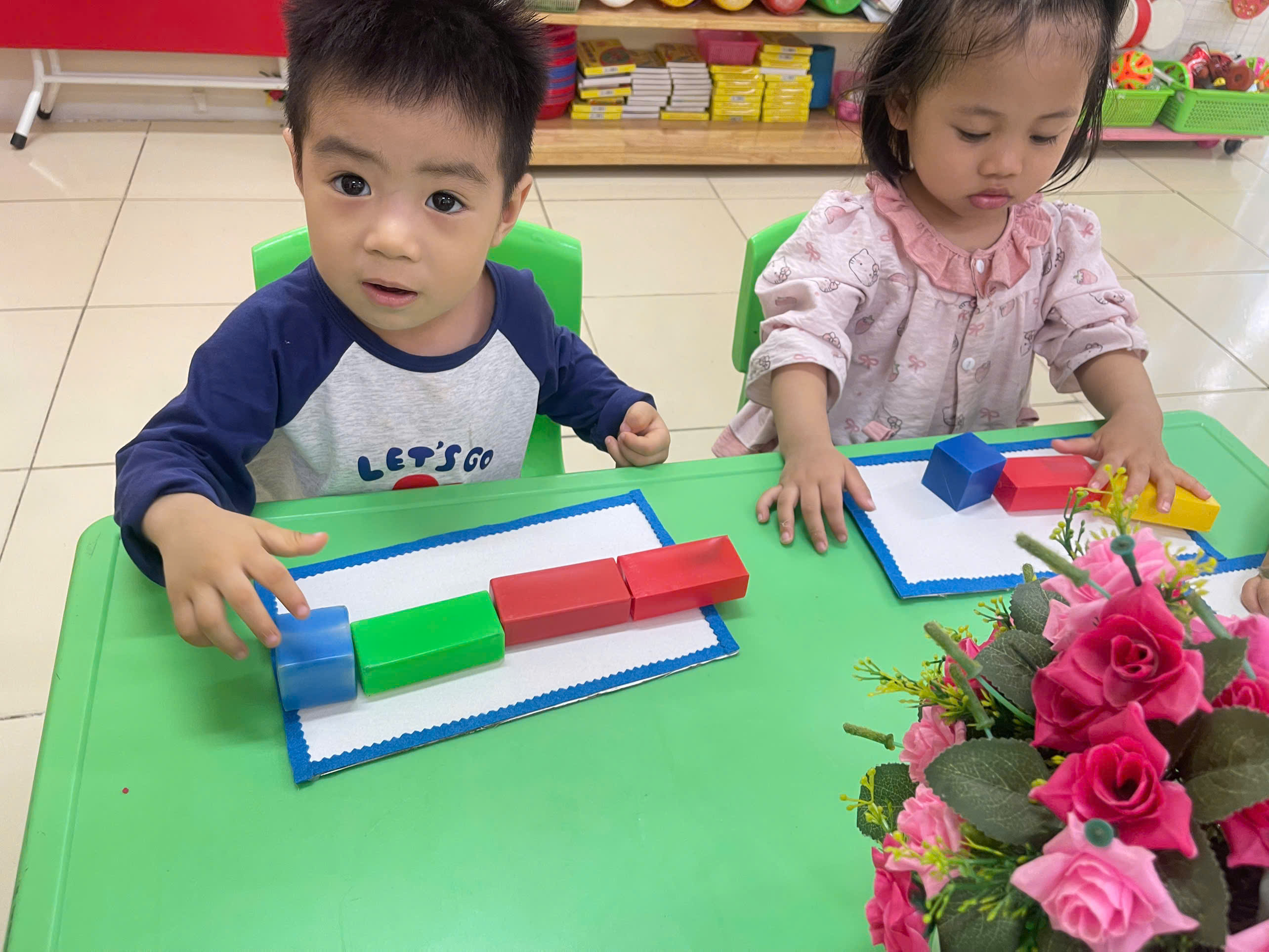 bạn nhỏ lớp B2 đã cùng nhau xếp những đoàn tàu thật ngộ nghĩnh từ các hình khối
