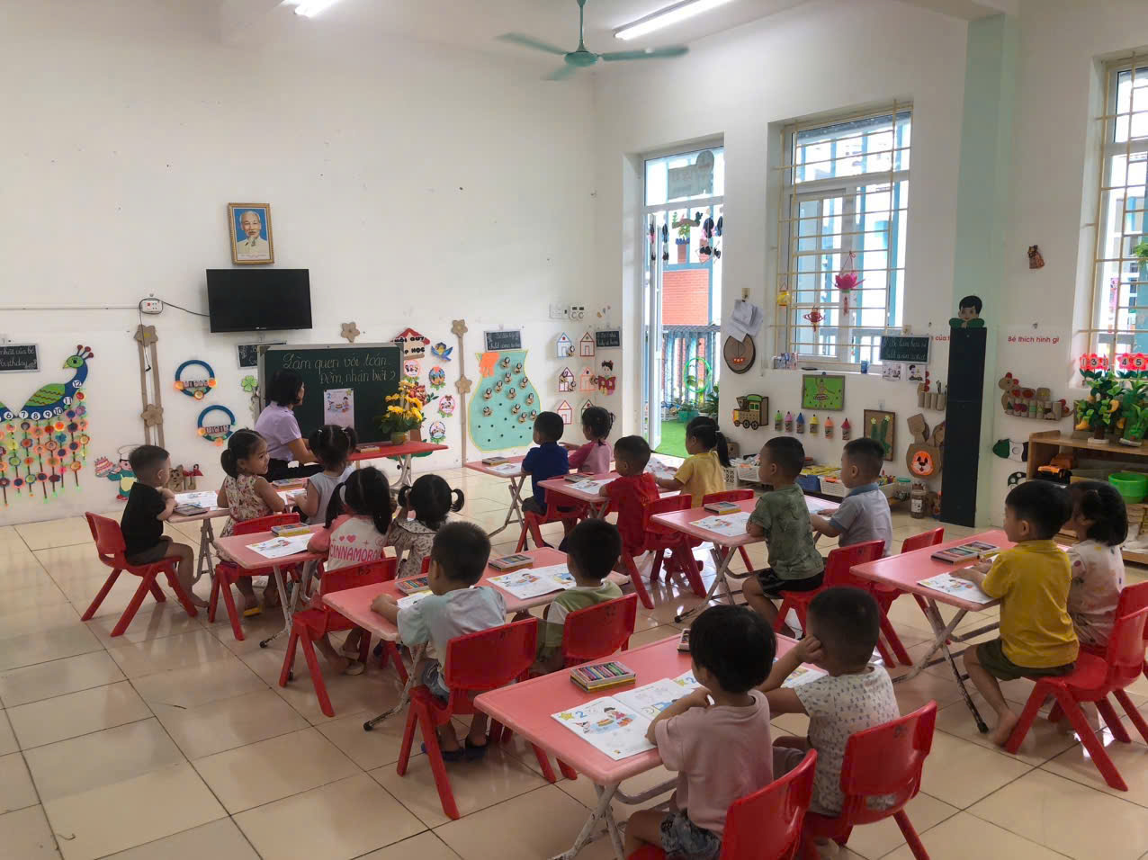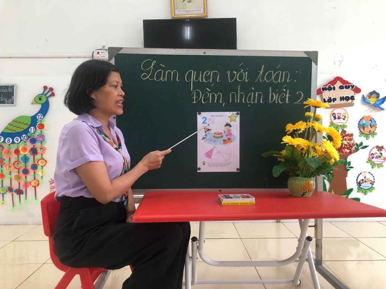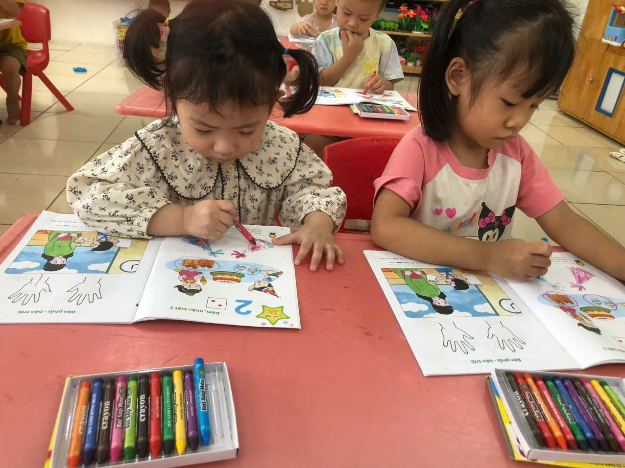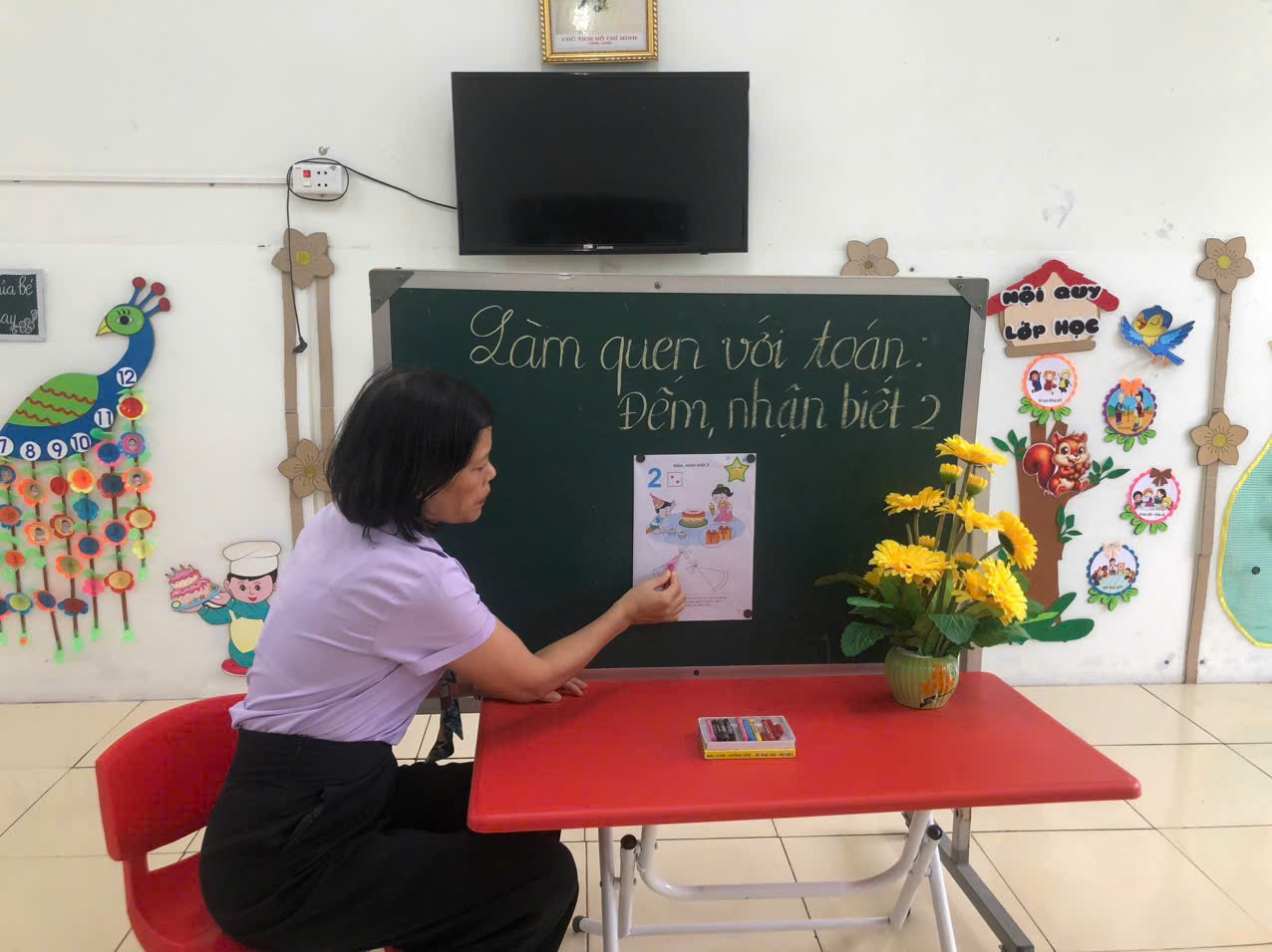Các bạn nhỏ lớp A3 tiếp tục được cô rèn các kỹ năng cách cầm bút, tư thế ngồi học ngay ngắn…qua hoạt động làm quen với toán: Đếm, nhận biết 2