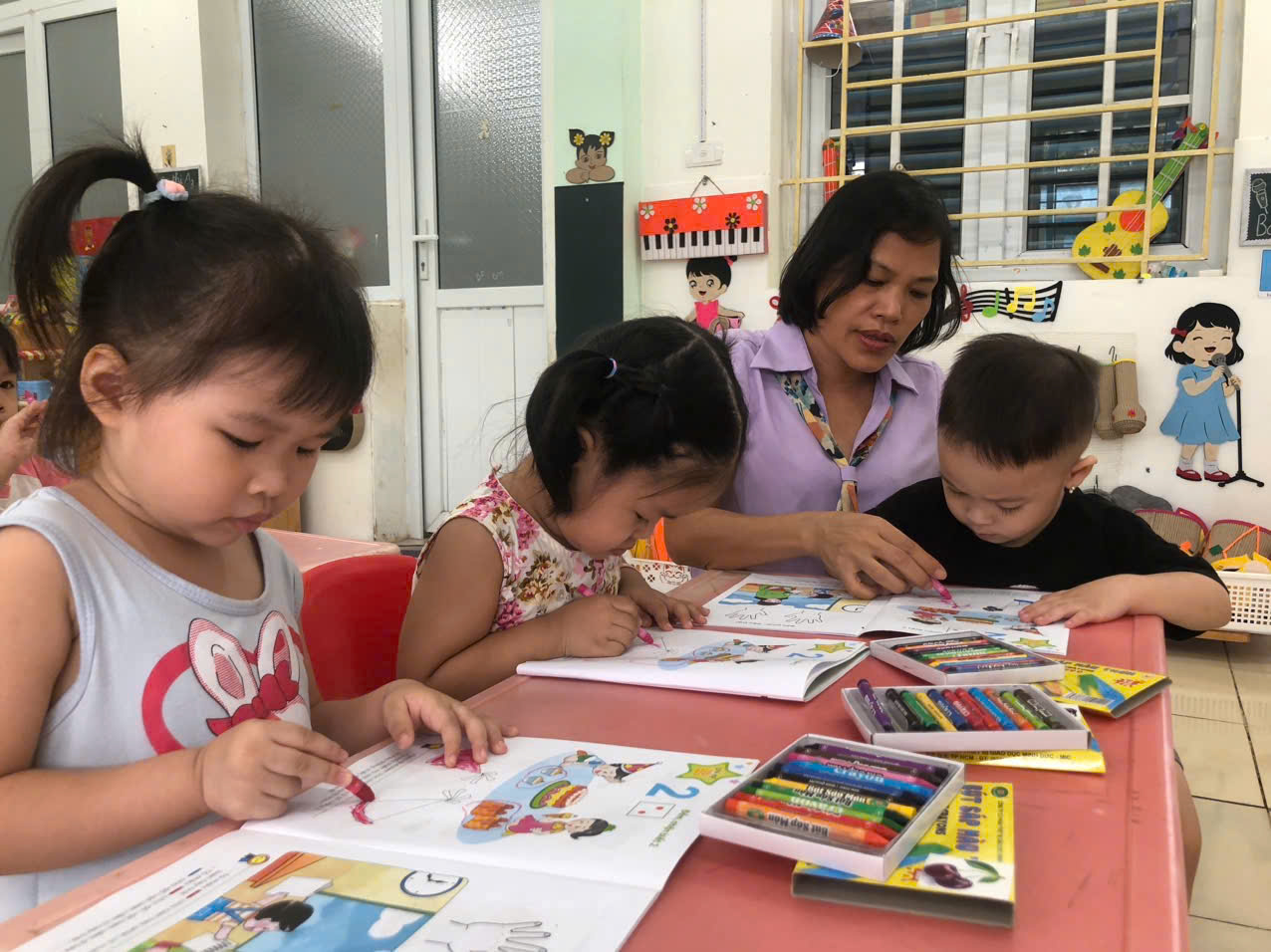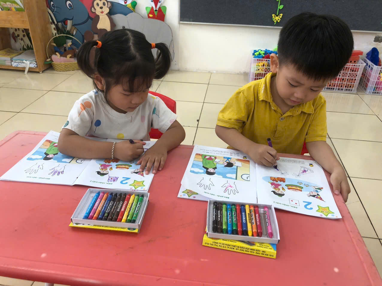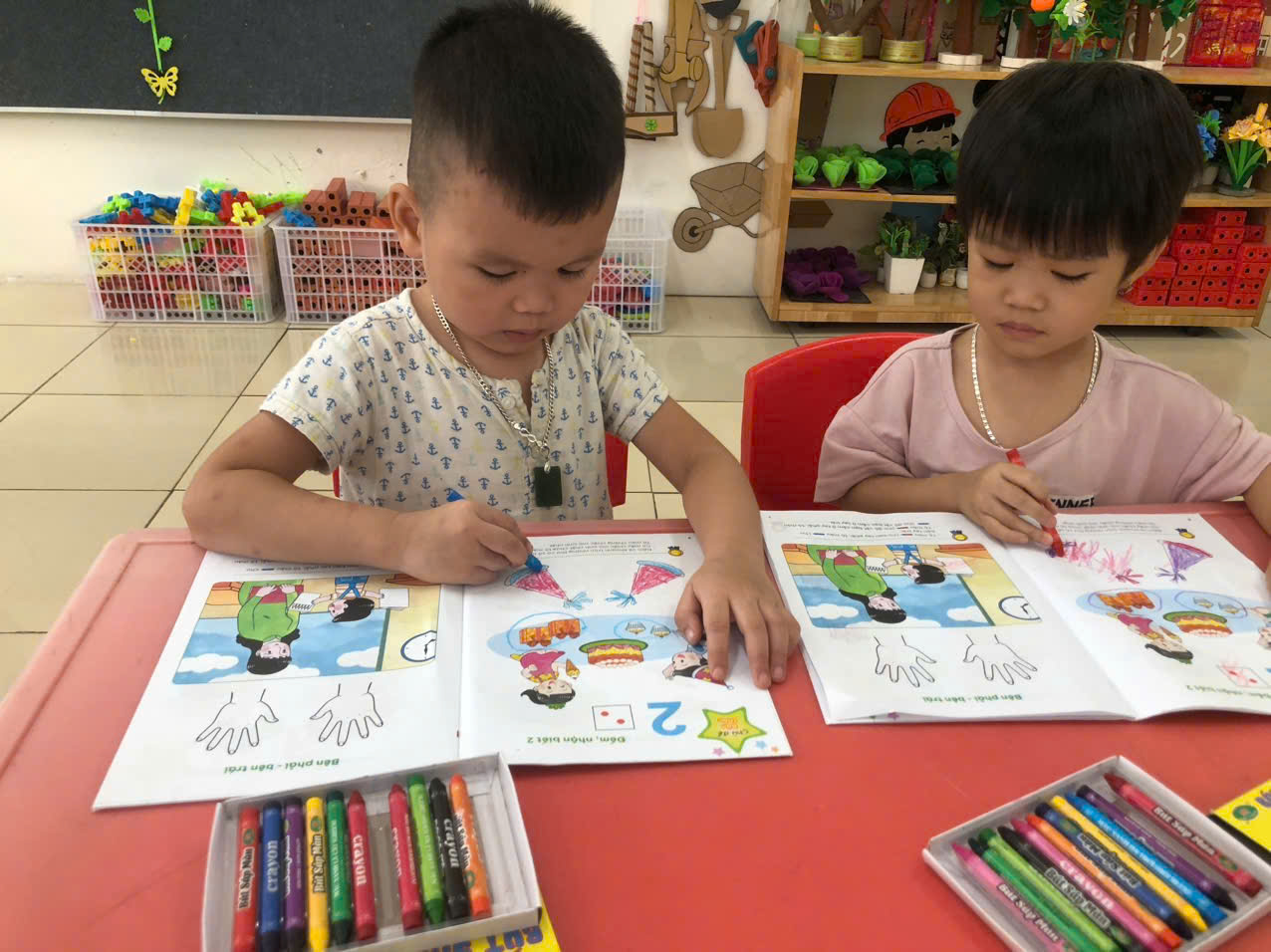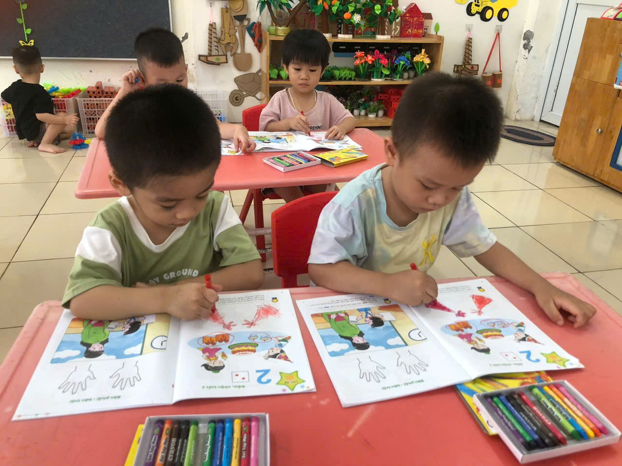 Các bạn nhỏ lớp A3 tiếp tục được cô rèn các kỹ năng cách cầm bút, tư thế ngồi học ngay ngắn…qua hoạt động làm quen với toán: Đếm, nhận biết 2