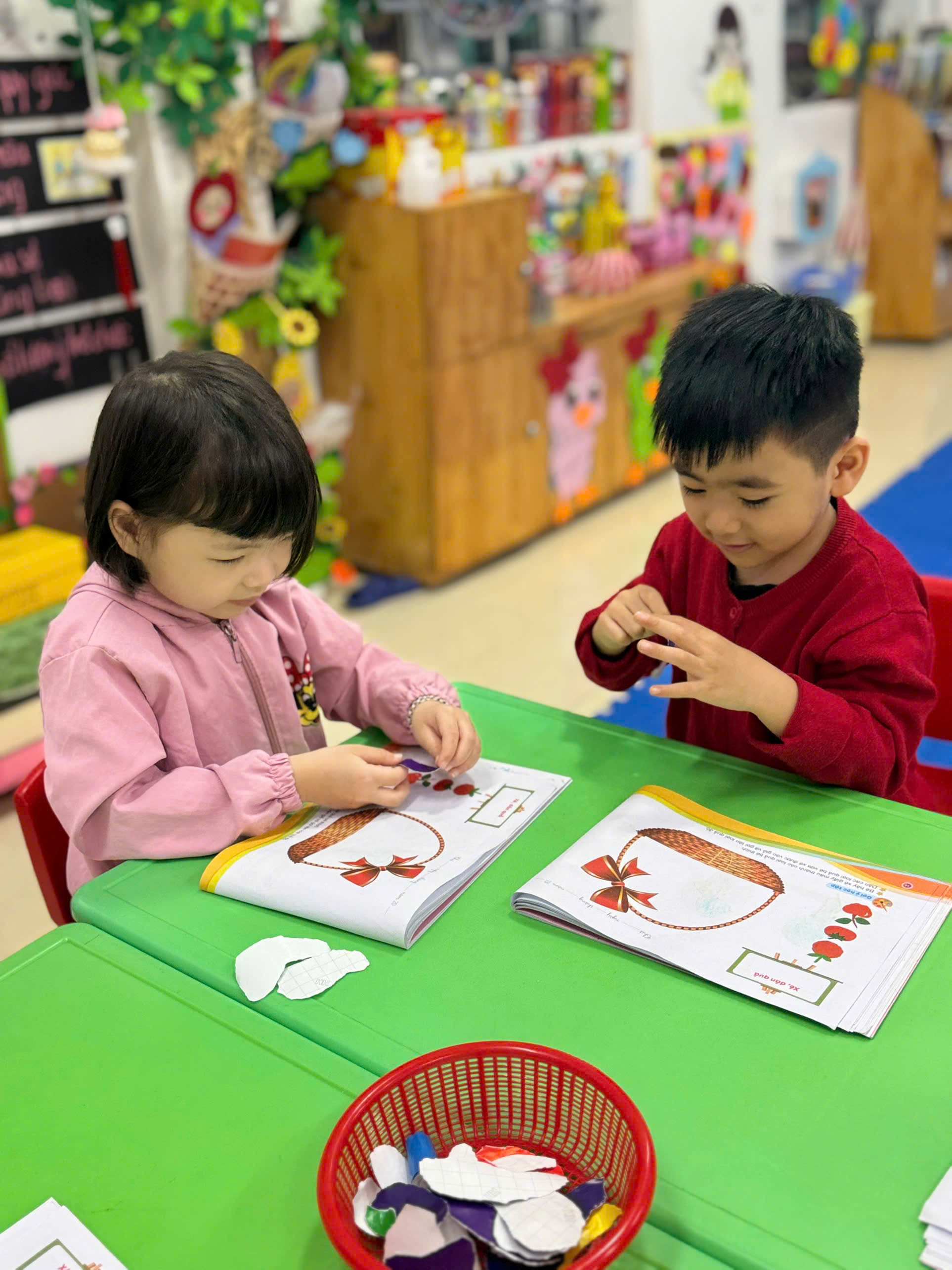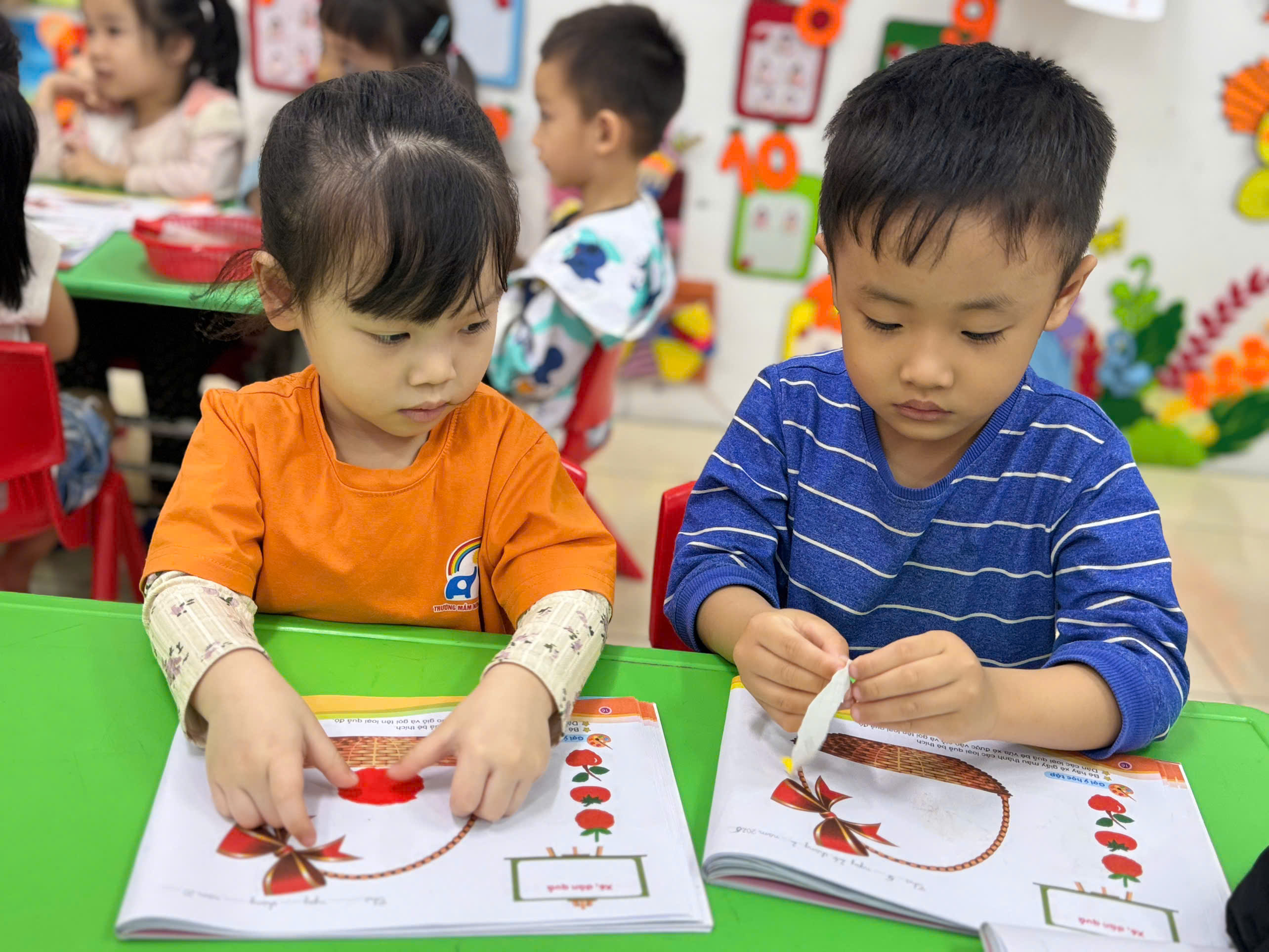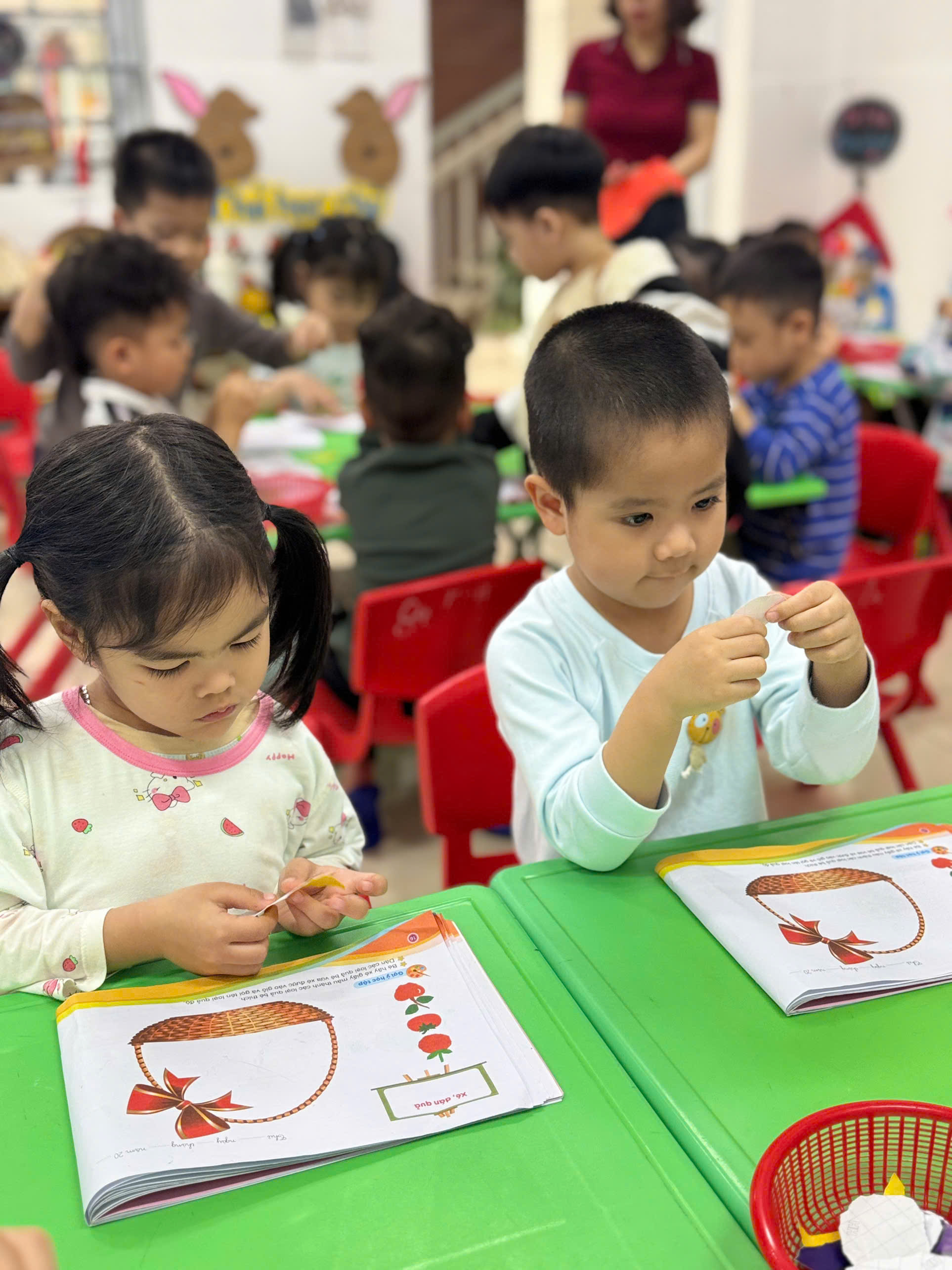 Các bạn nhỏ lớp A4 học Hoạt động tạo hình: “Xé, dán quả”.
