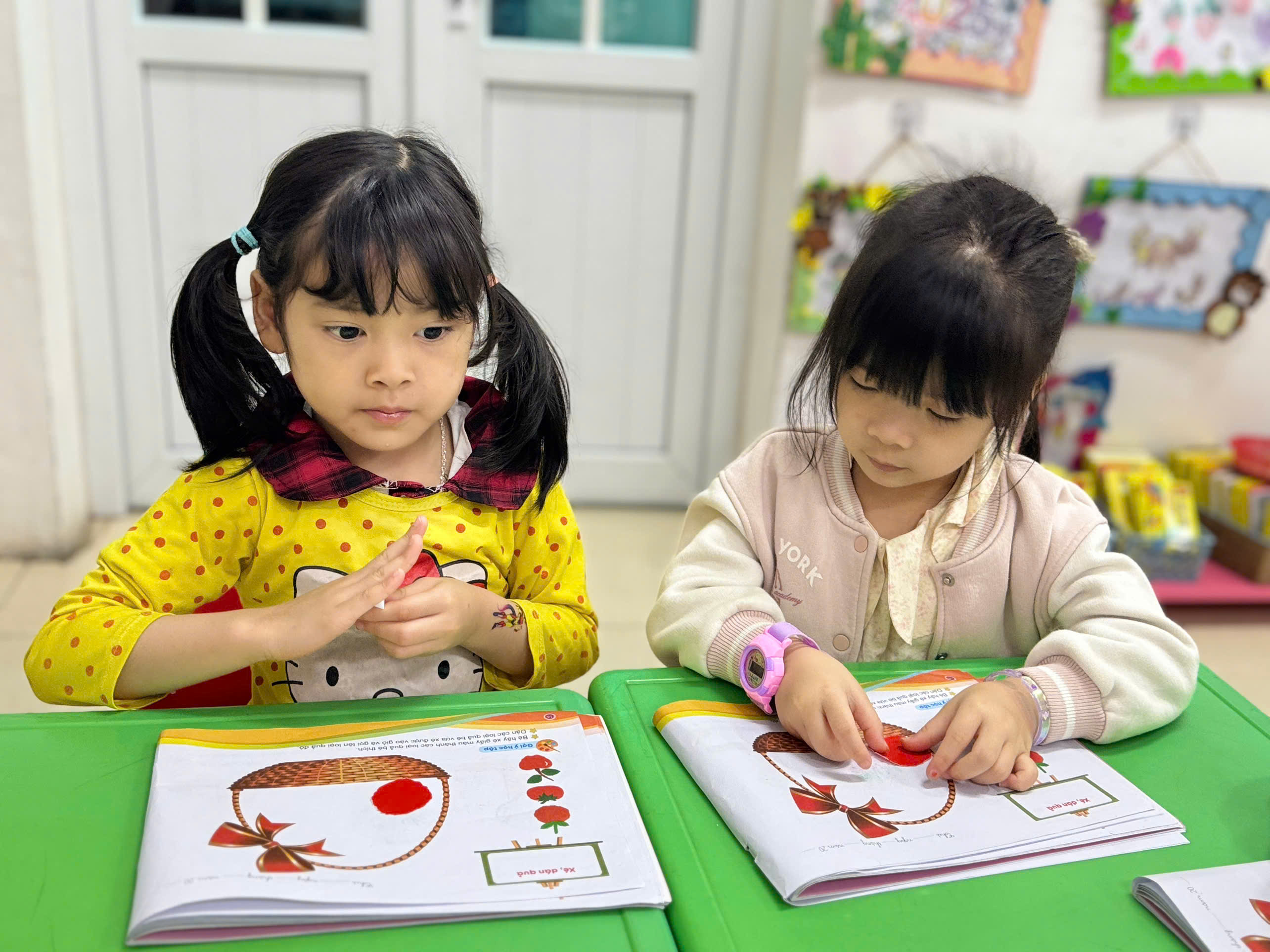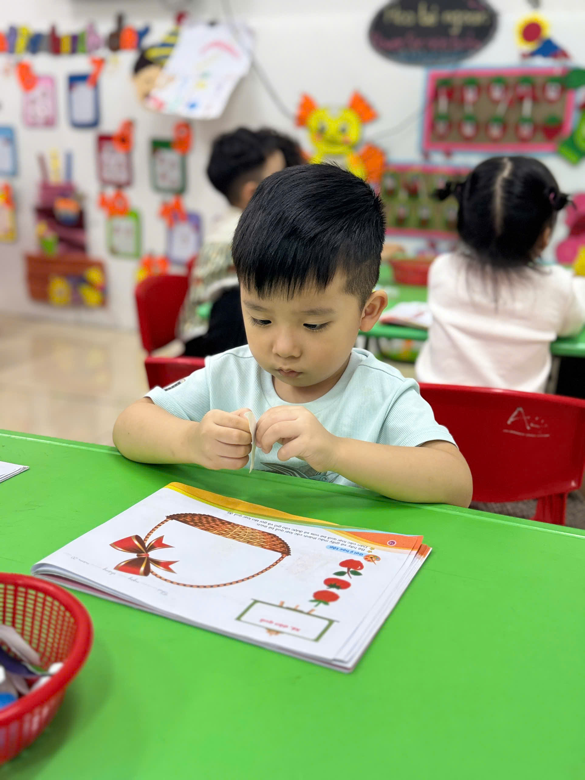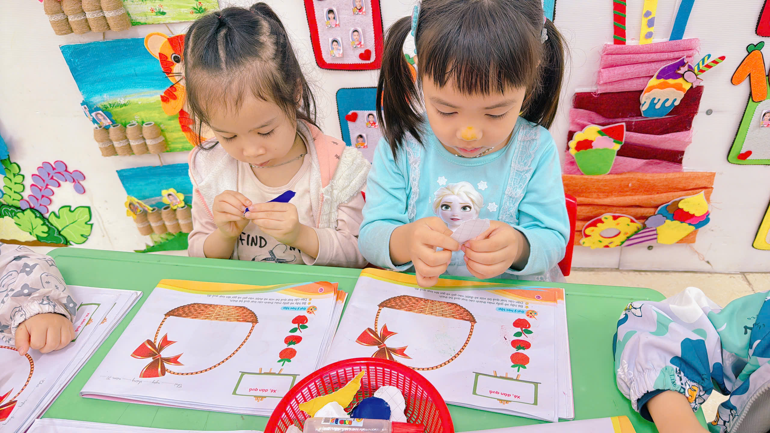 Các bạn nhỏ lớp A4 học Hoạt động tạo hình: “Xé, dán quả”.