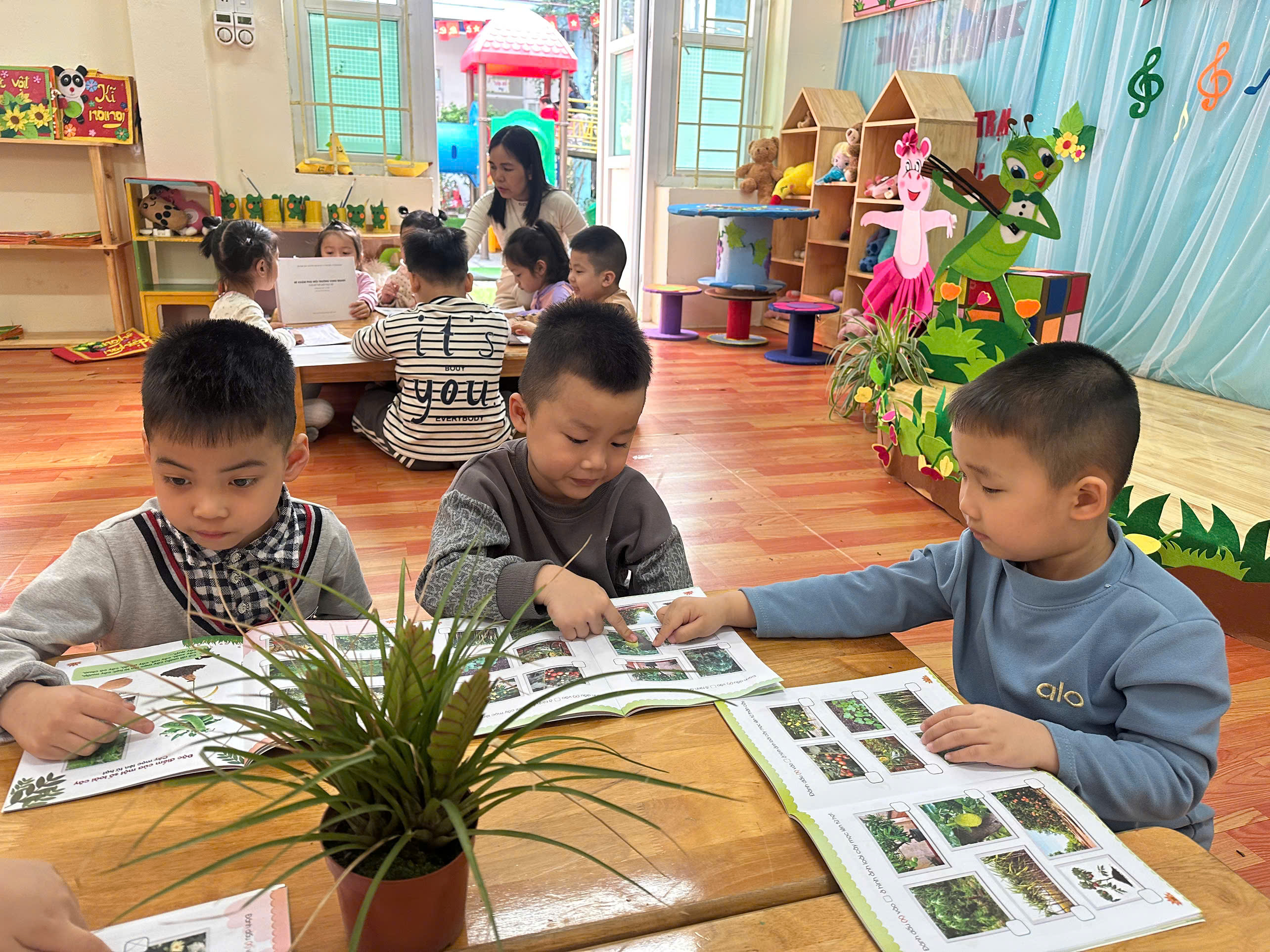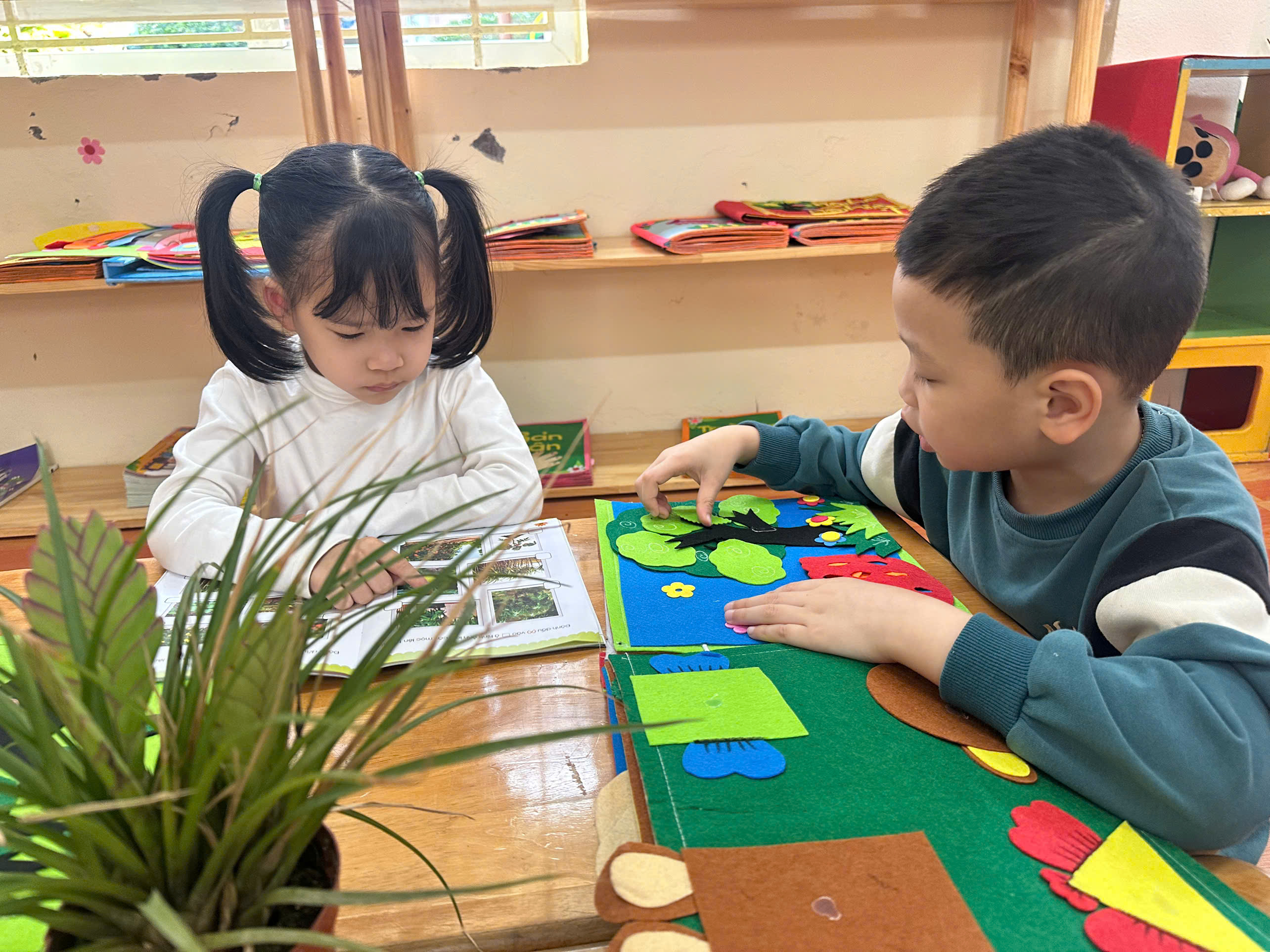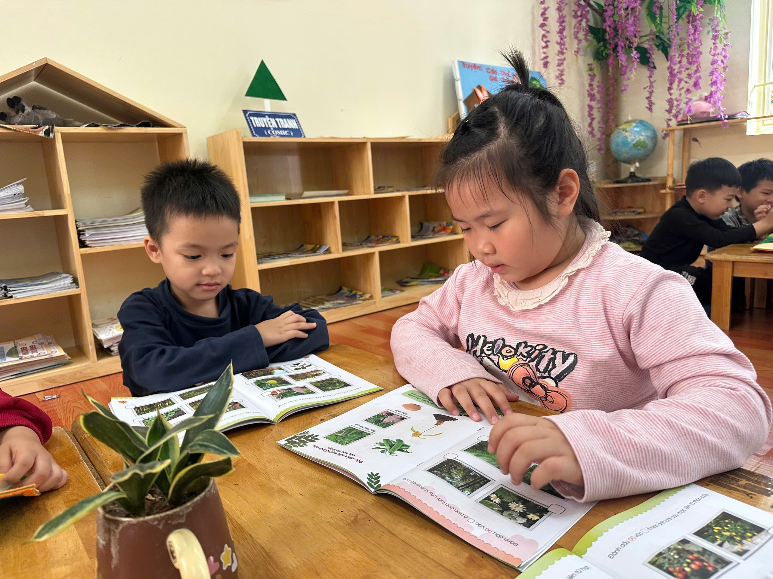 Các con lớp A3, E5 nay được hoạt động tại phòng thư viện: Xem sách chuyện về chủ đề Qua tiết học các con biết xem sách có nội dung về cây cối, hoa, quả. Trẻ nhận biết được một số loại cây, hoa, quả quen thuộc qua tranh ảnh trong sách.Trẻ hiểu cây xanh mang lại lợi ích cho con người và môi trường. Qua đó rèn các con có kỹ năng xem sách đúng cách: mở sách nhẹ nhàng, lật từng trang.Phát triển ngôn ngữ, khả năng trao đổi với bạn. Các con lớp A3, E5 rất hứng thú khi xem sách và biết giữ gìn sách cẩn thận, không làm rách sách.