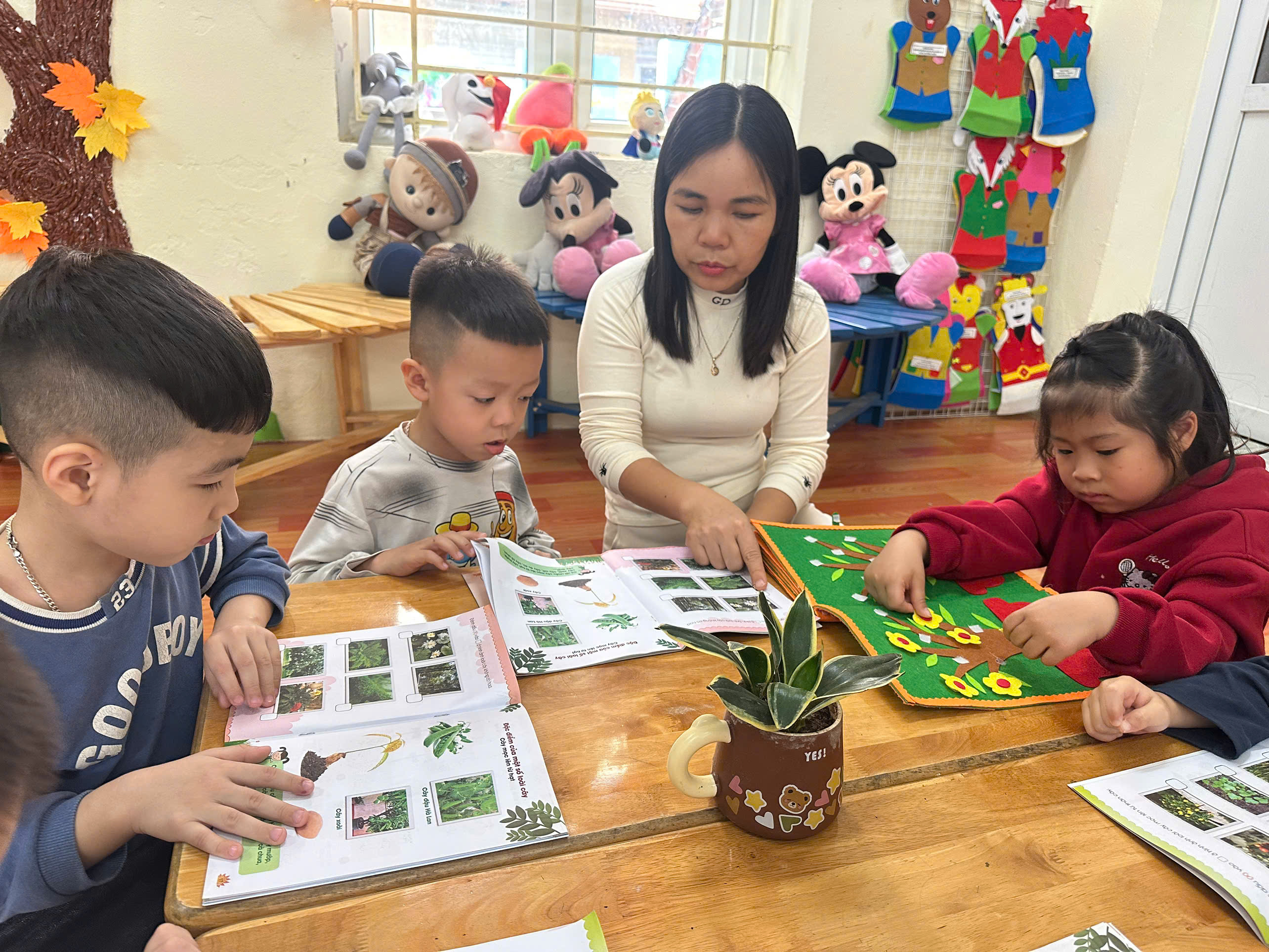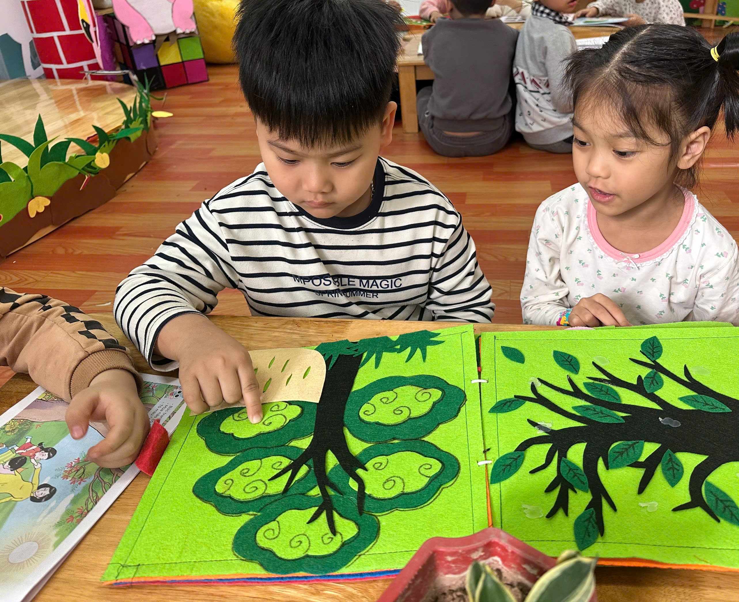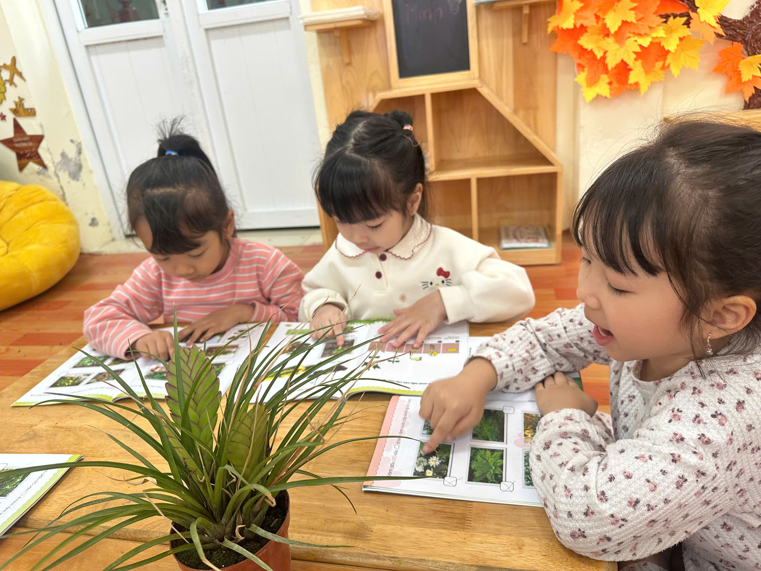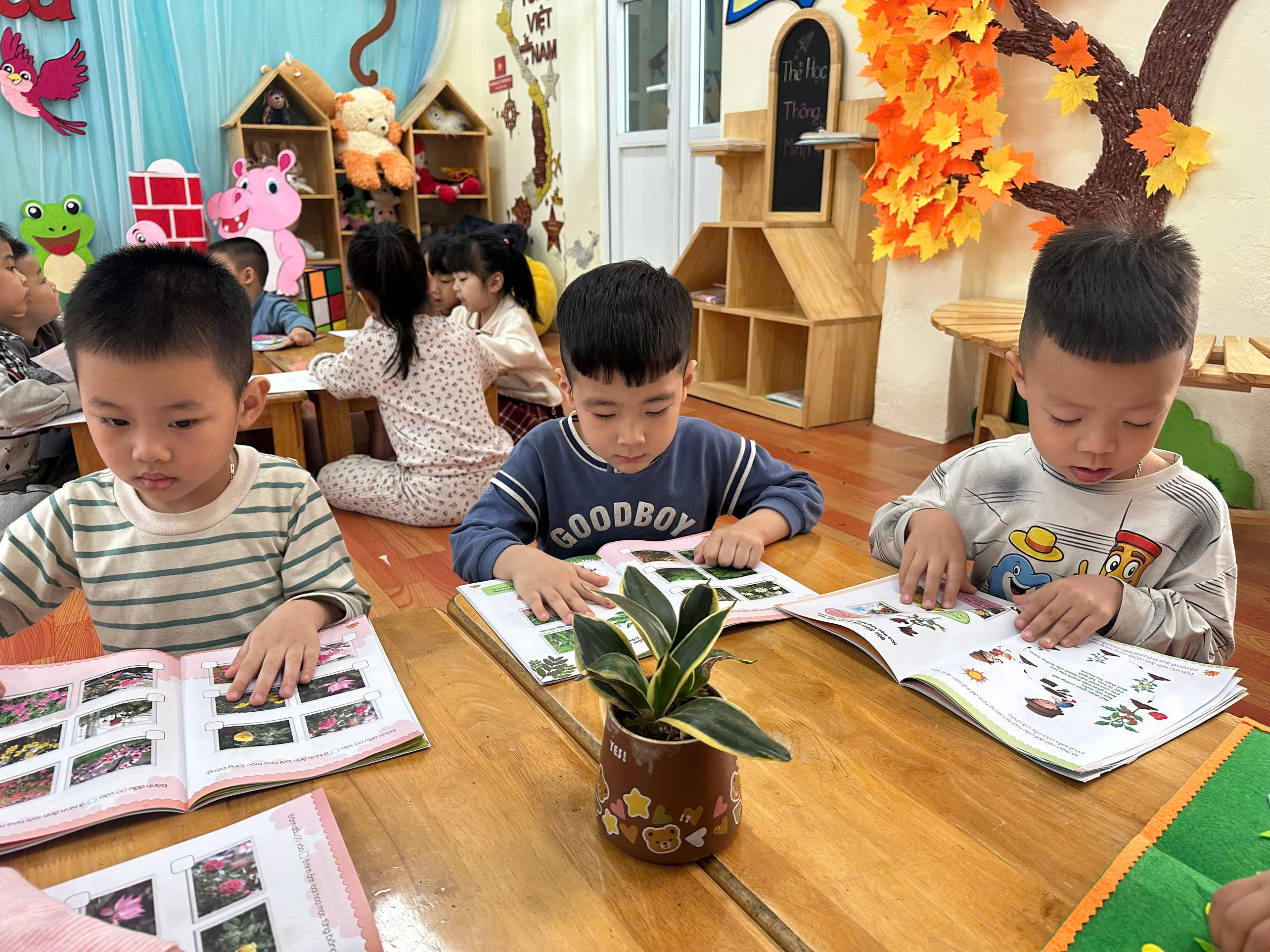 Các con lớp A3, E5 nay được hoạt động tại phòng thư viện: Xem sách chuyện về chủ đề Qua tiết học các con biết xem sách có nội dung về cây cối, hoa, quả. Trẻ nhận biết được một số loại cây, hoa, quả quen thuộc qua tranh ảnh trong sách.Trẻ hiểu cây xanh mang lại lợi ích cho con người và môi trường. Qua đó rèn các con có kỹ năng xem sách đúng cách: mở sách nhẹ nhàng, lật từng trang.Phát triển ngôn ngữ, khả năng trao đổi với bạn. Các con lớp A3, E5 rất hứng thú khi xem sách và biết giữ gìn sách cẩn thận, không làm rách sách.