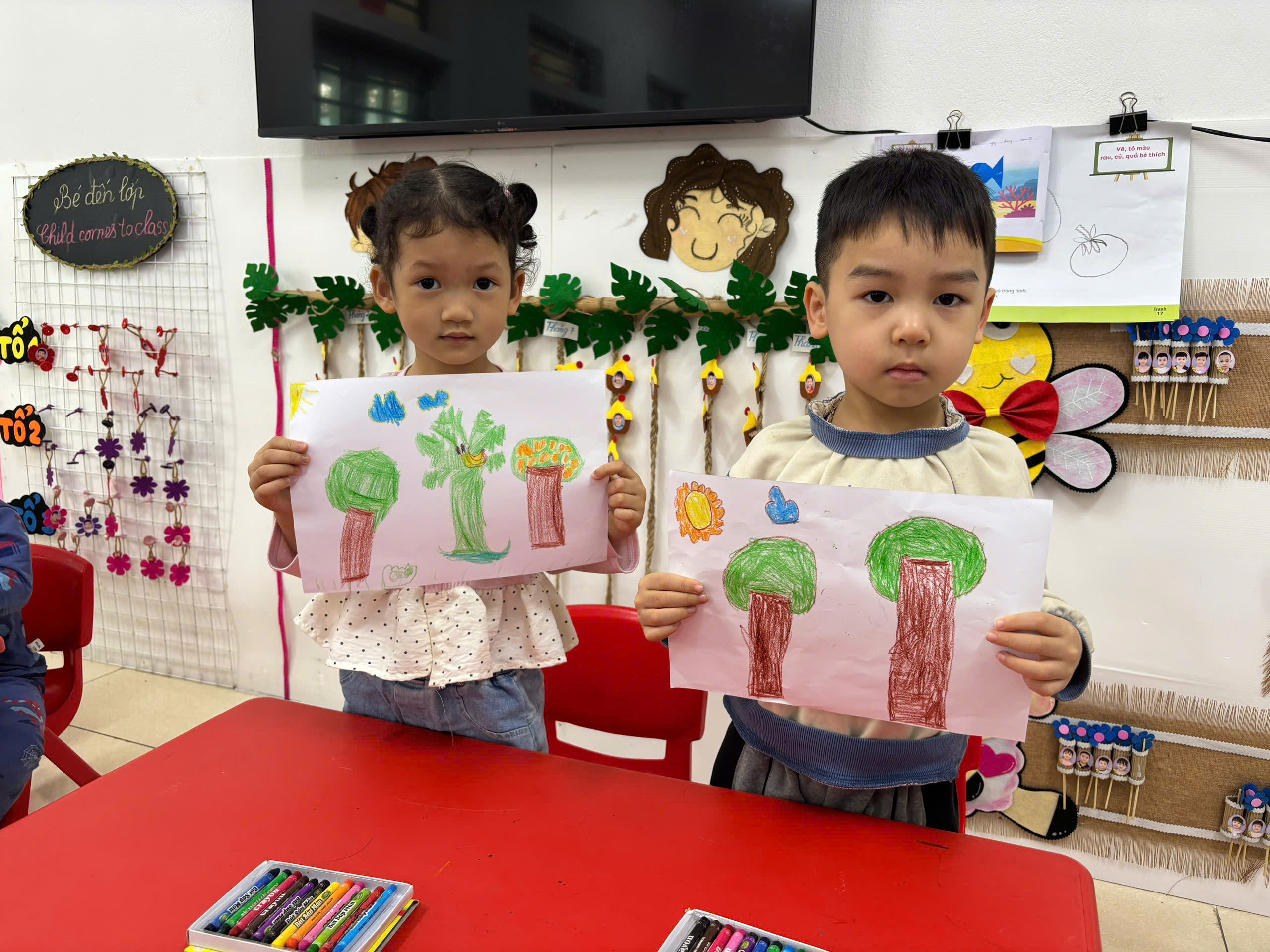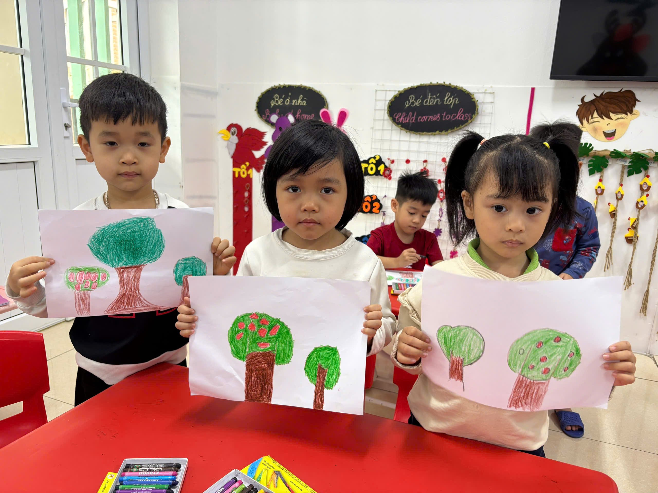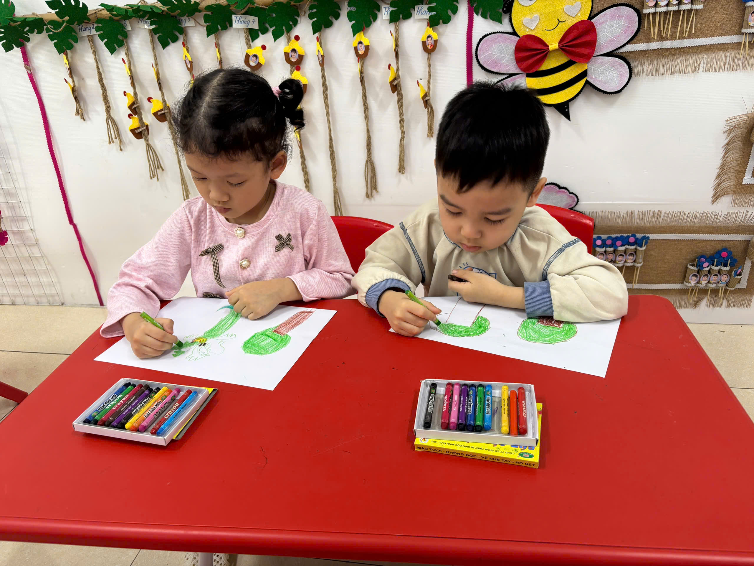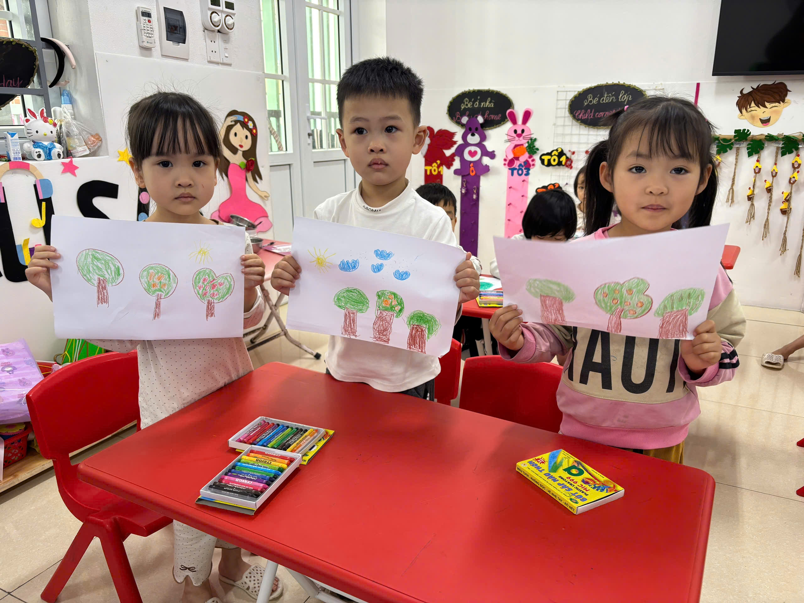 Các con lớp C4 được tham gia hoạt động tạo hình vẽ cây xanh.