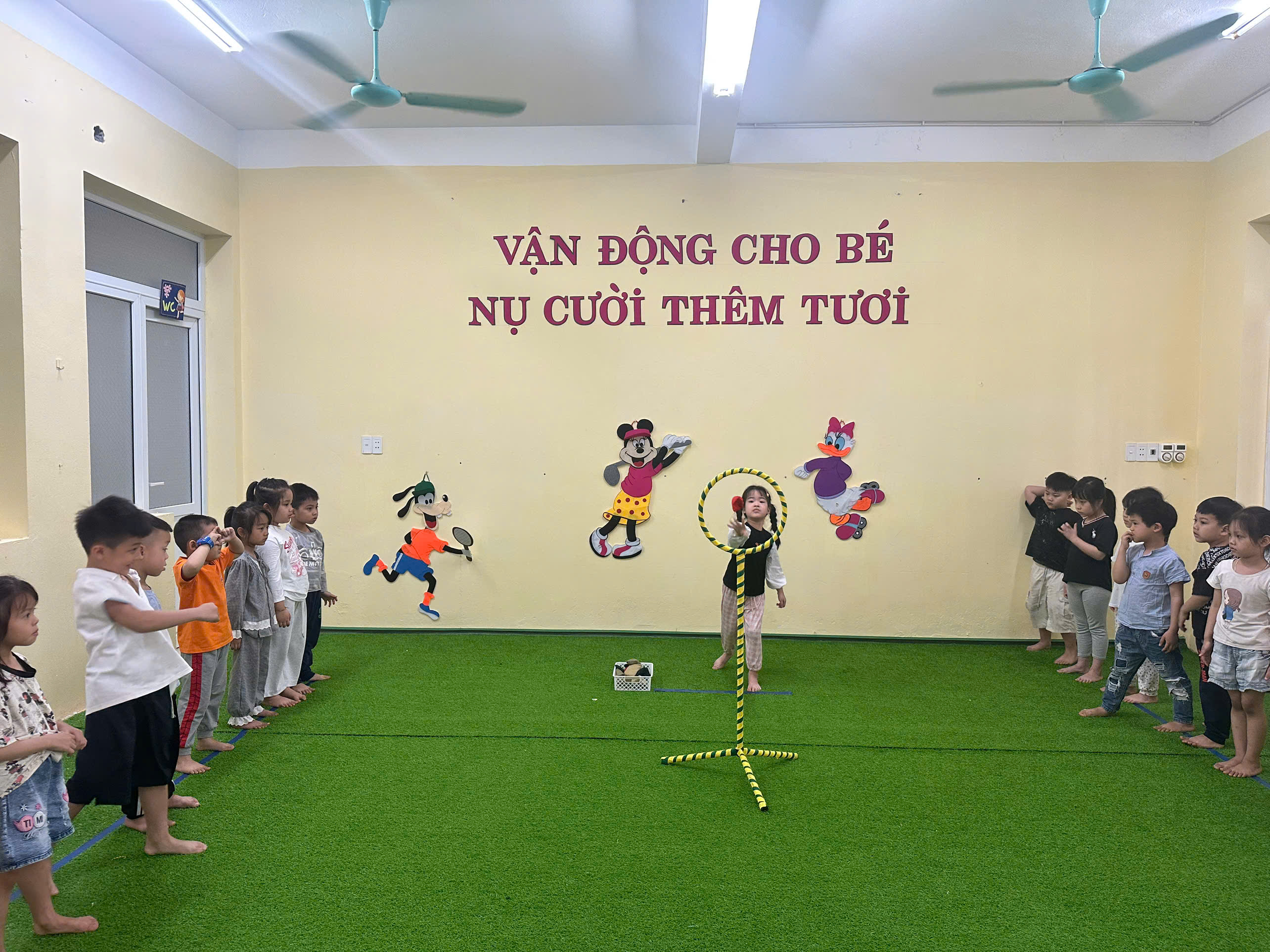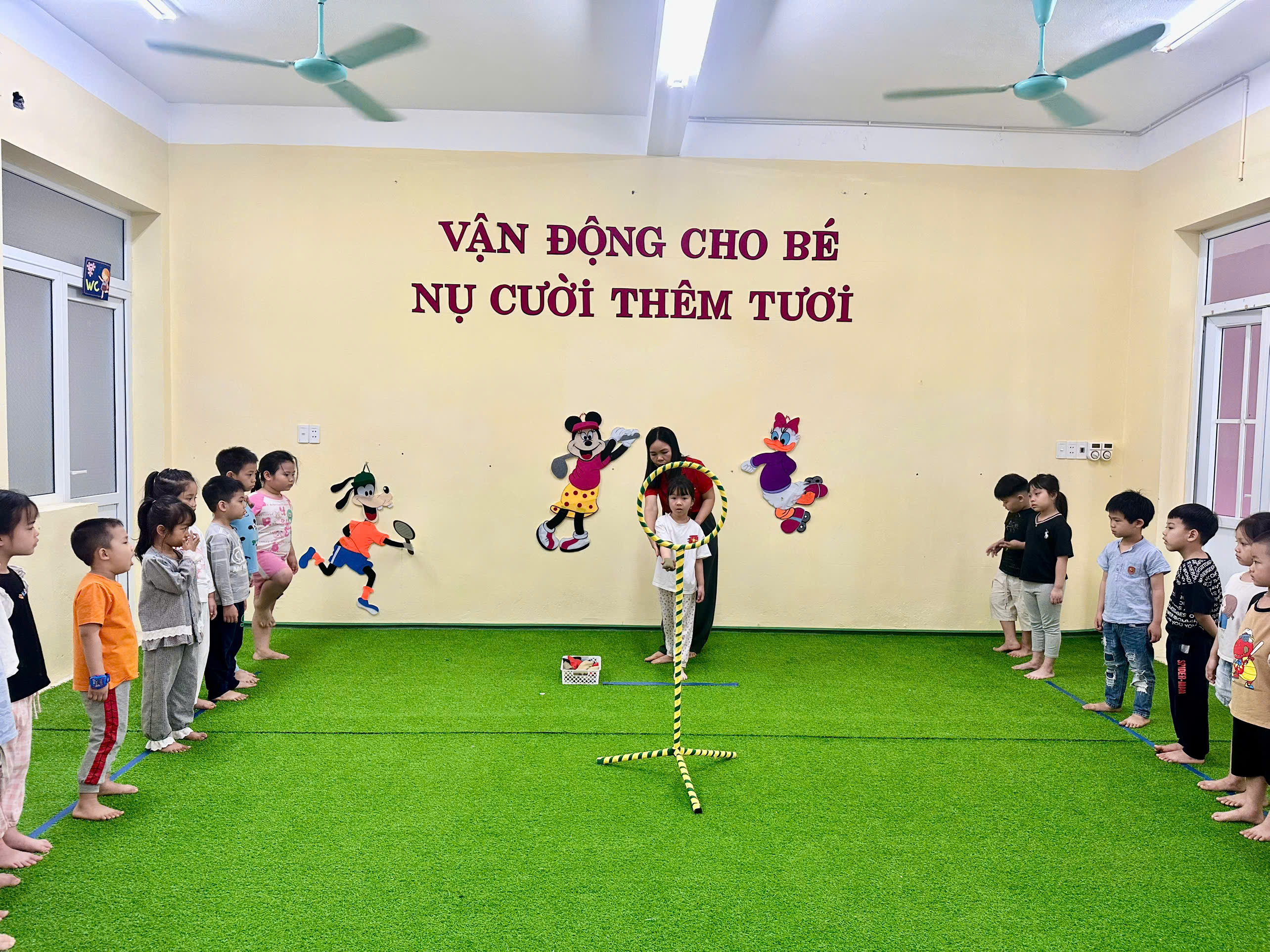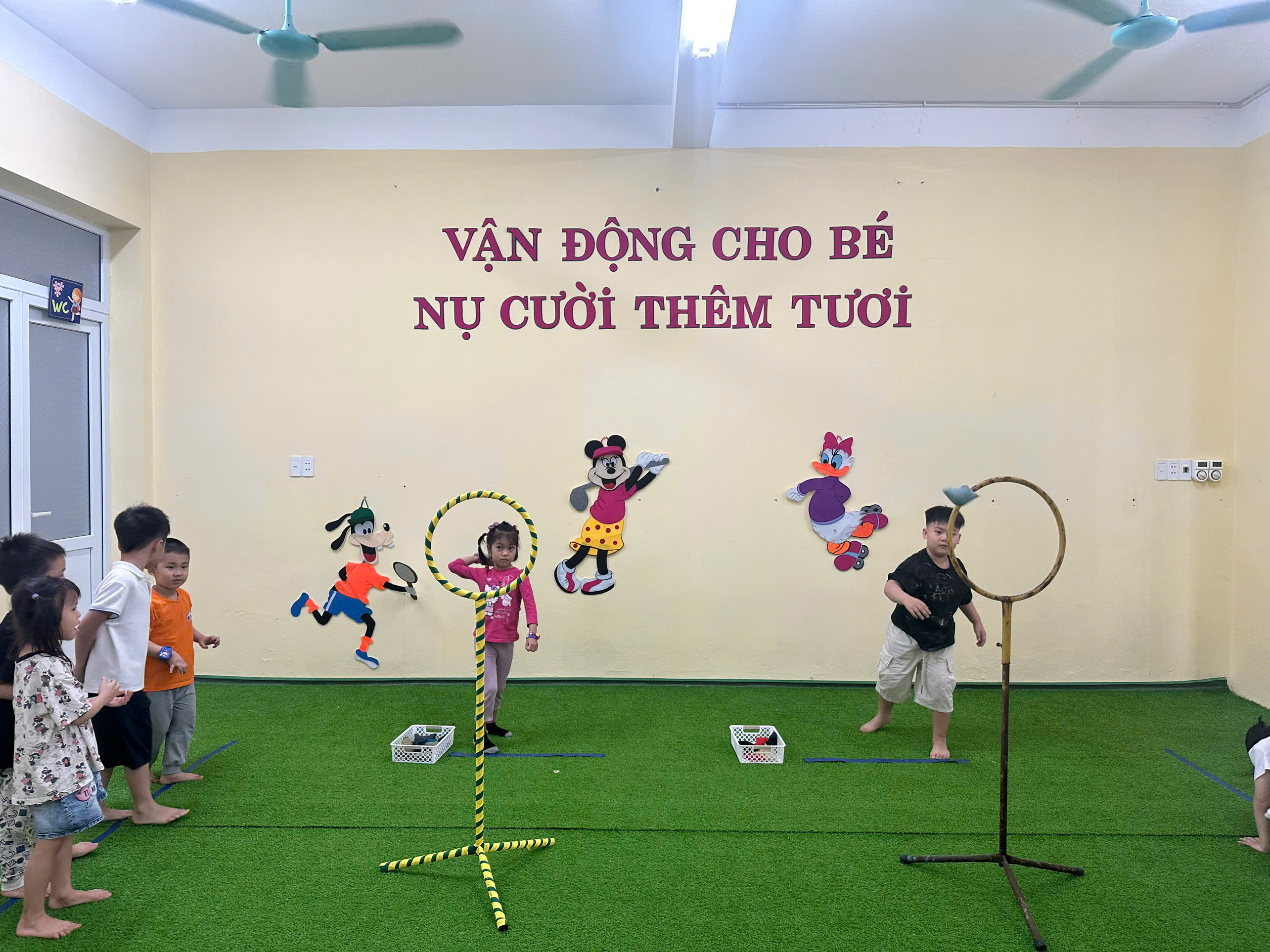 Qua tiết học này trẻ biết cách ném trúng đích bằng 1 tay. Biết phối hợp tay – mắt khi ném. Các con được rèn kỹ năng ném chính xác vào đích. Phát triển cơ tay, sự khéo léo và định hướng không gian. Các con lớp E5 rất hứng thú tham gia hoạt động.