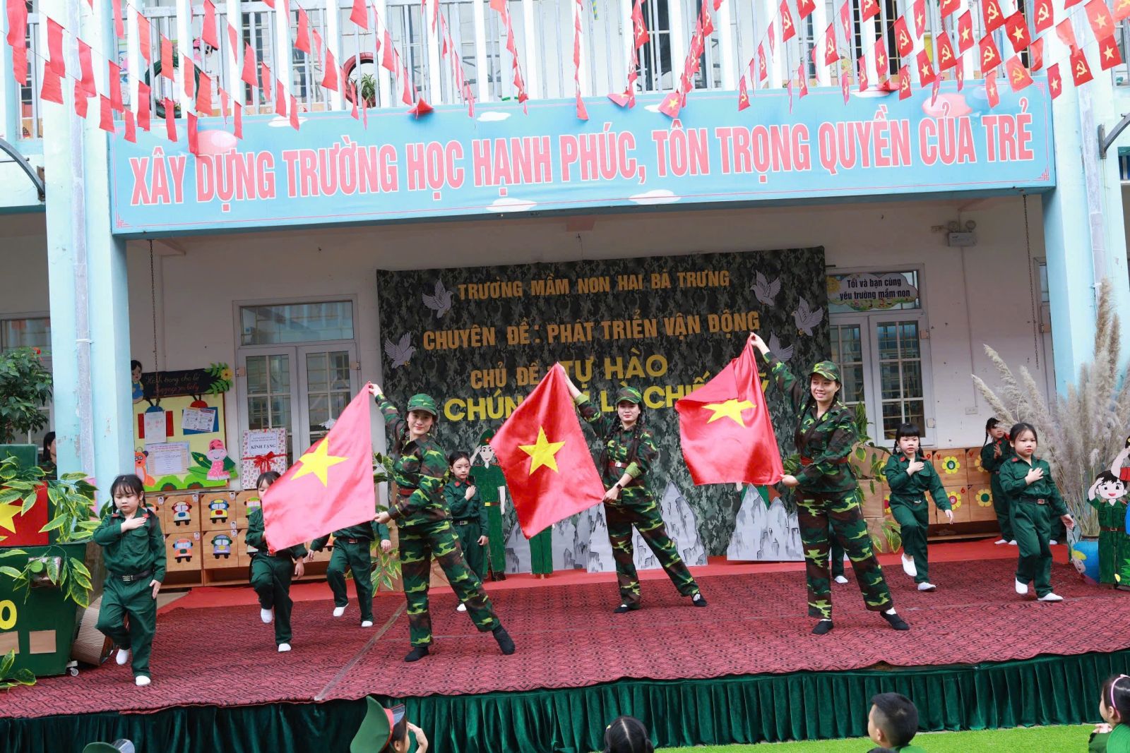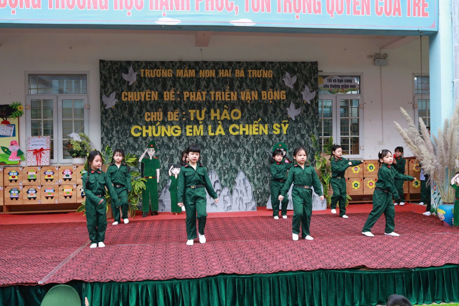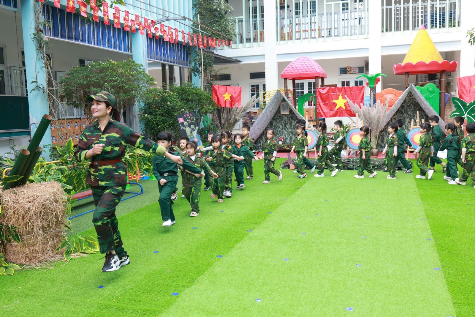 Được khoác lên mình bộ trang phục chú bộ đội các con đi diễu hành với những bước chân nhỏ mang theo sự hồn nhiên rất riêng của tuổi thơ. Cùng với màn đồng diễn gồm những động tác khoẻ khoắn và ánh mắt đầy háo hức, tự hào. Và không chỉ dừng lại ở đó các con được tham gia tập luyện tại thao trường và bữa cơm hành quân.