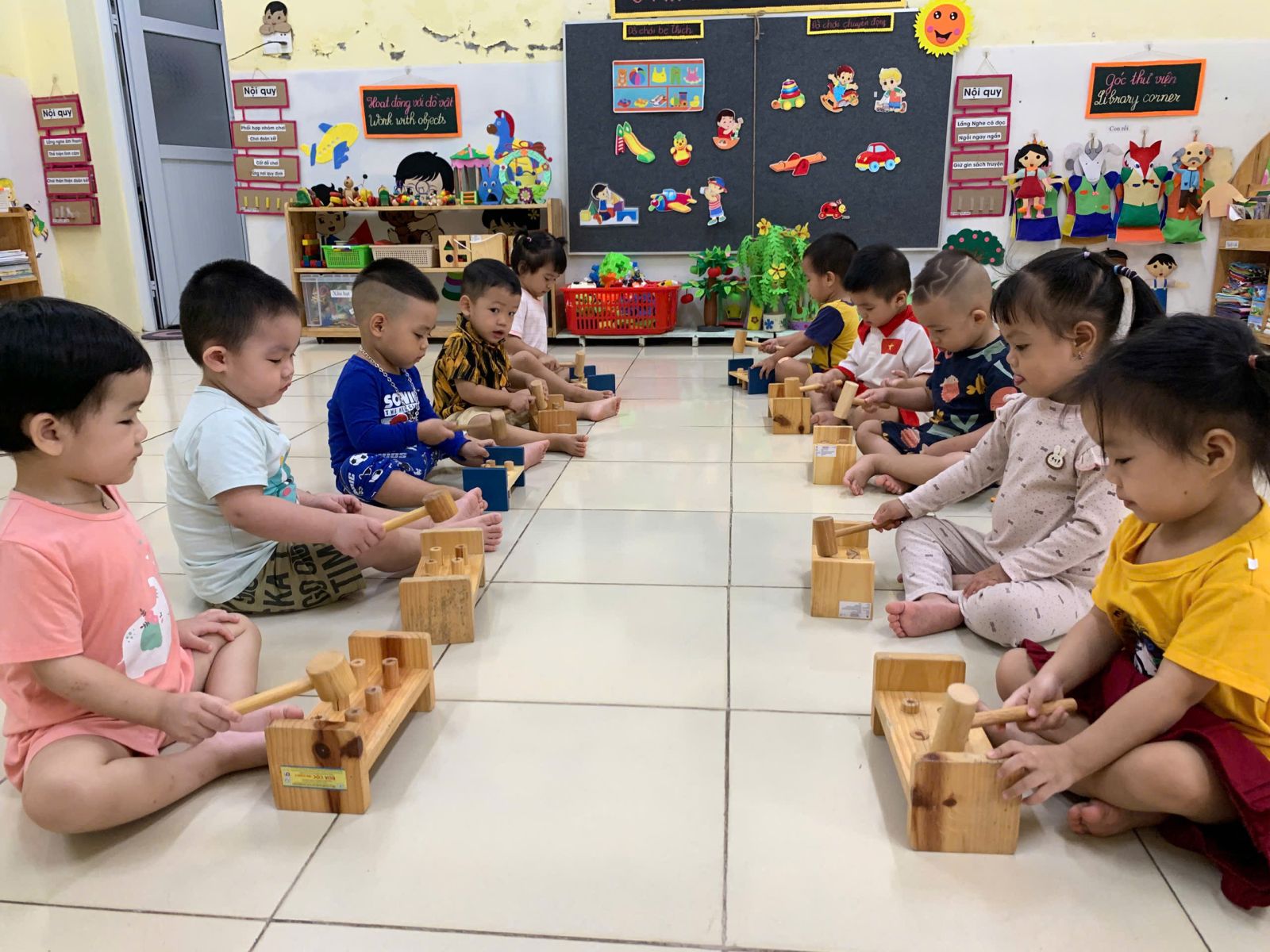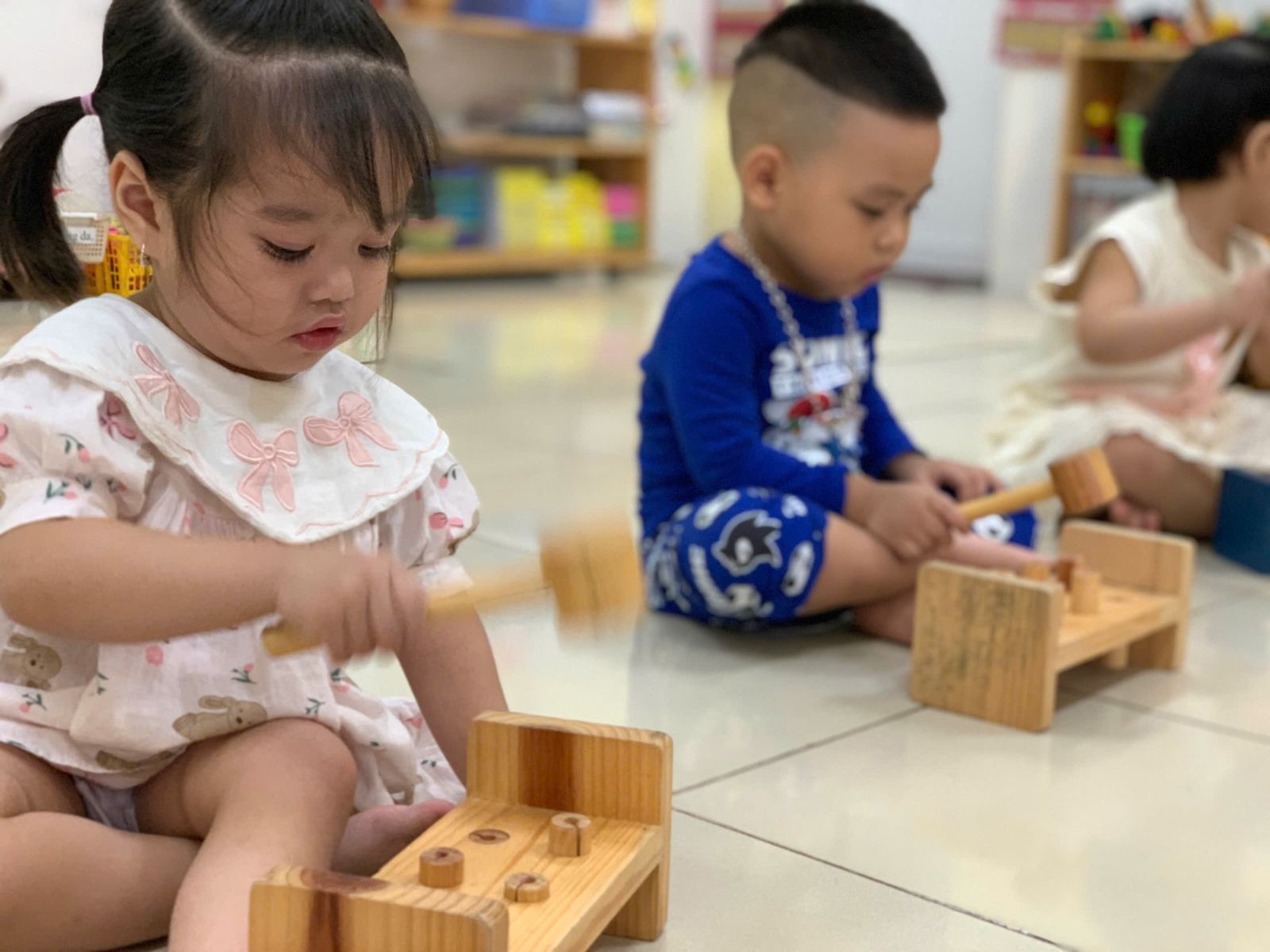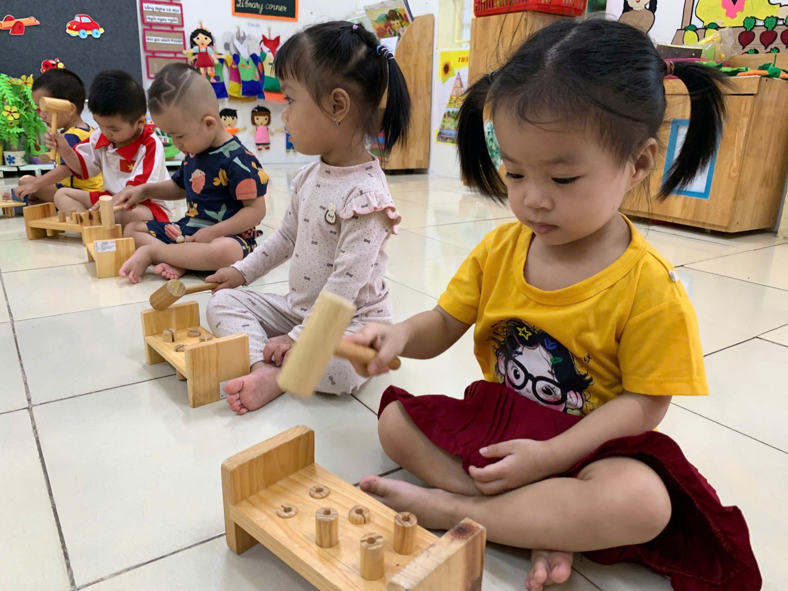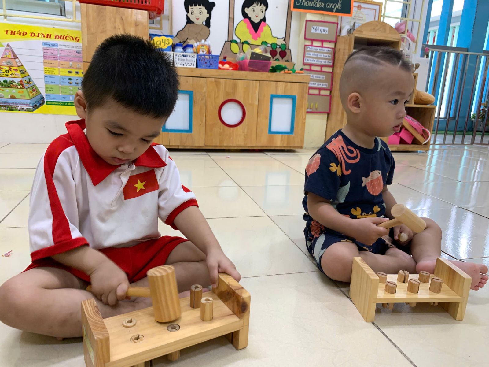 Dạy trẻ kỹ năng : Đóng cọc bàn gỗ của các em bé lớp A2