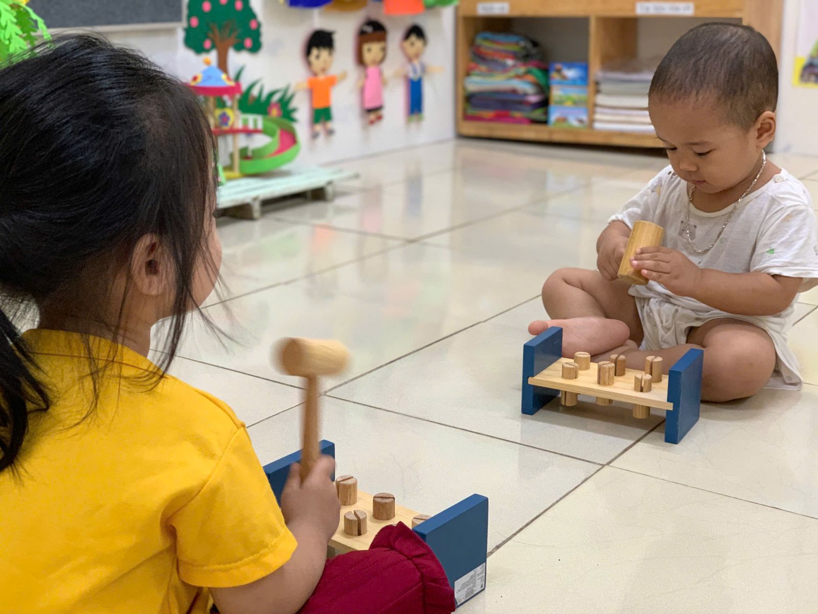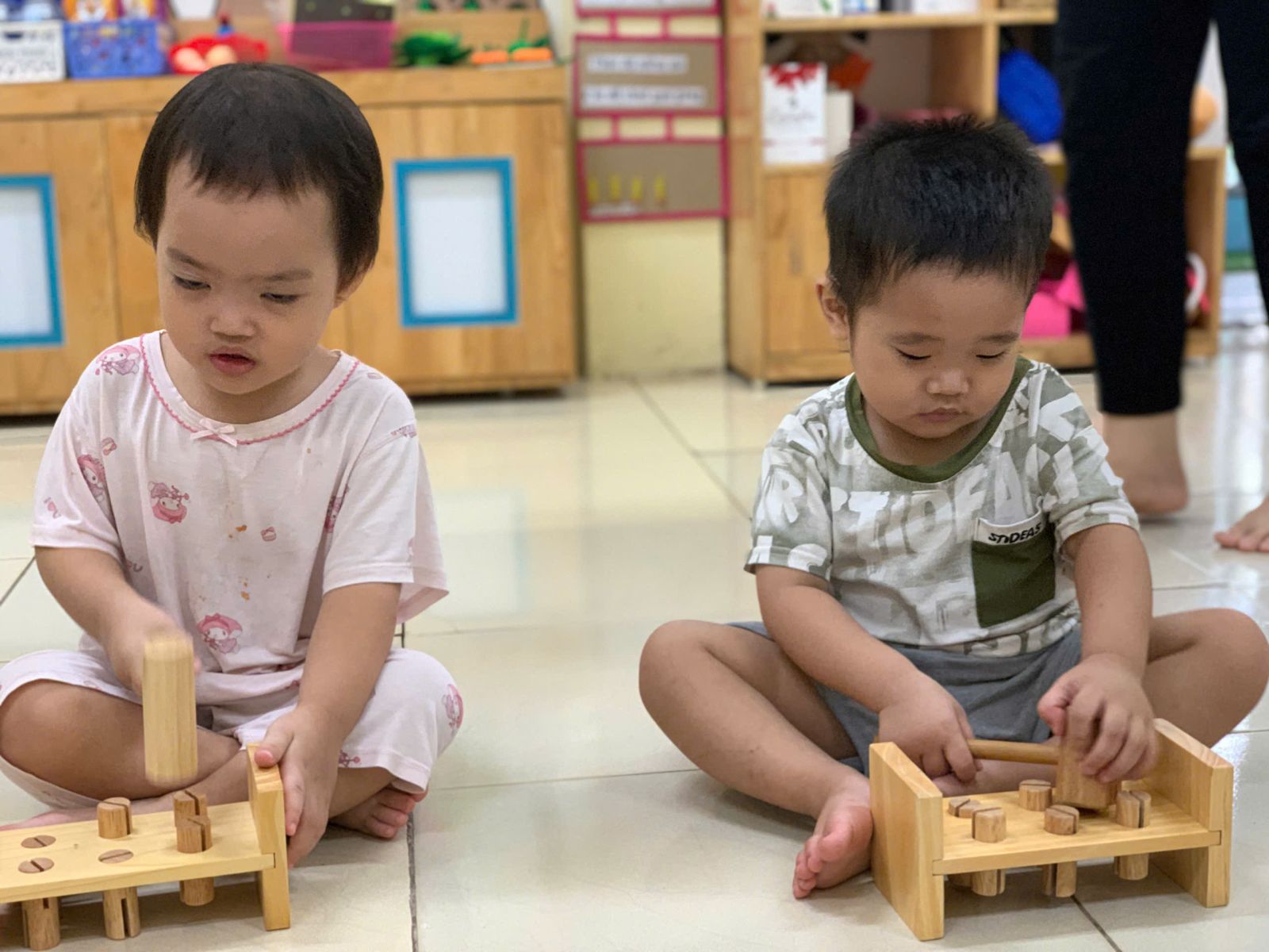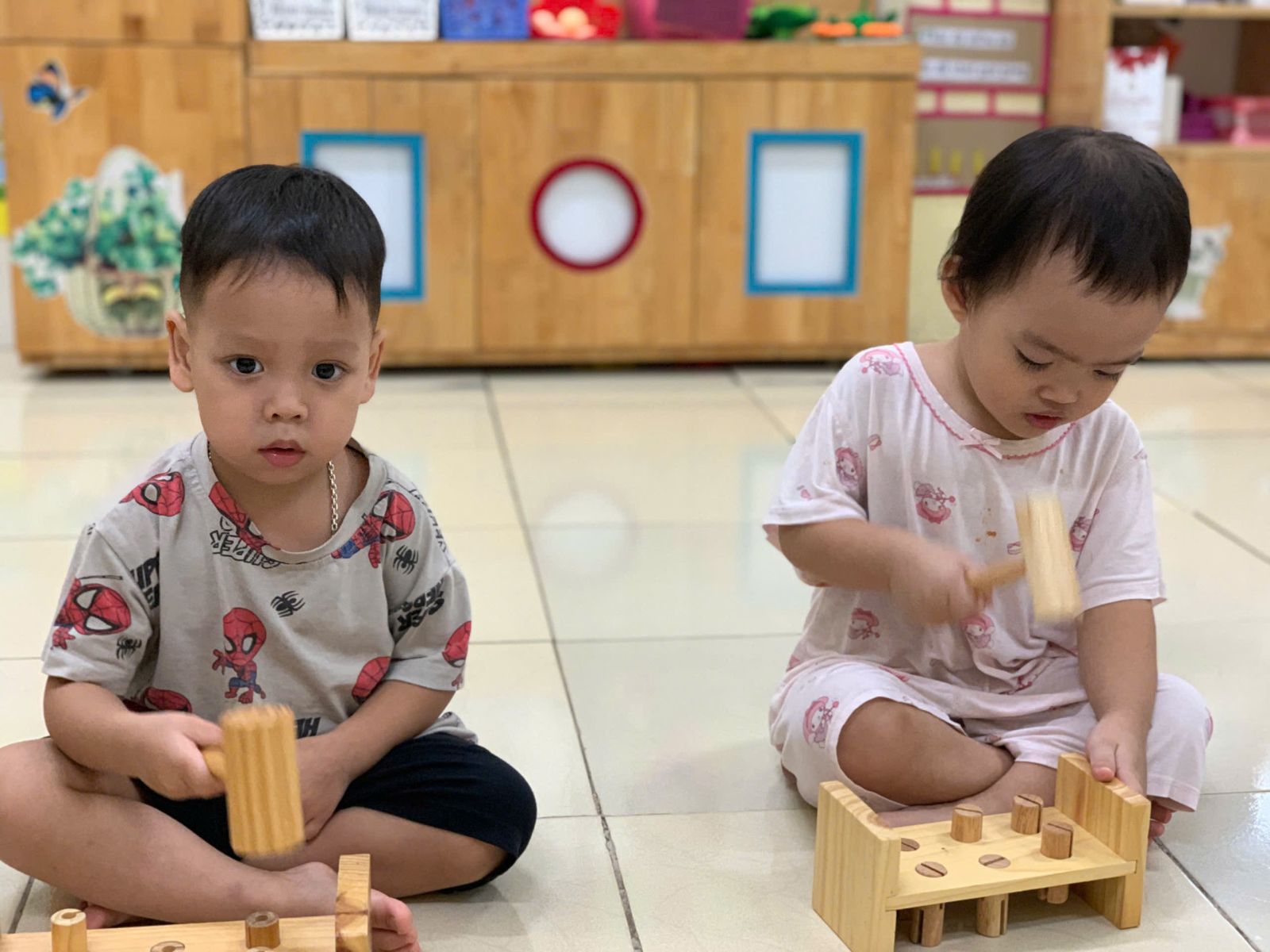 Dạy trẻ kỹ năng : Đóng cọc bàn gỗ của các em bé lớp A2