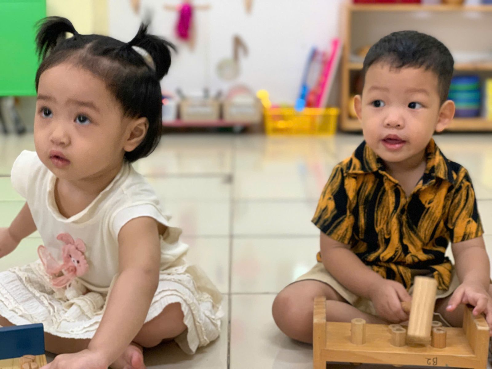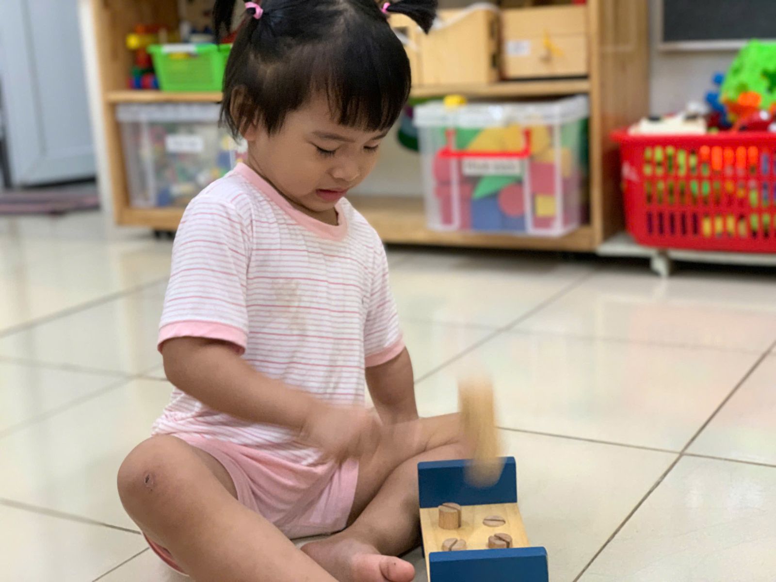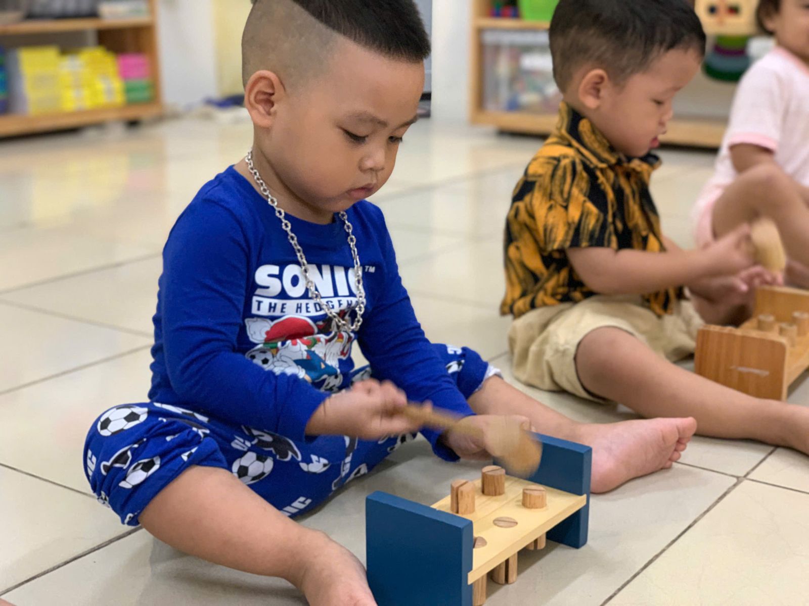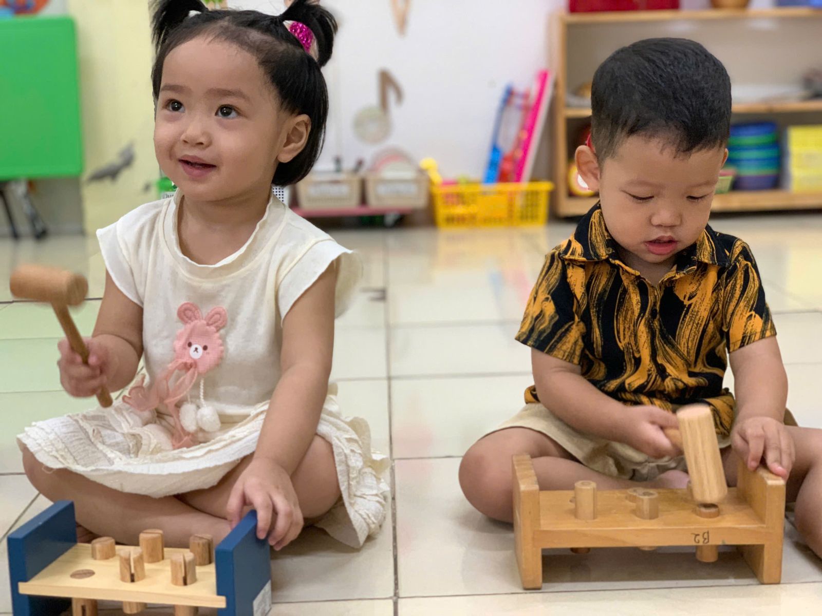 Dạy trẻ kỹ năng : Đóng cọc bàn gỗ của các em bé lớp A2