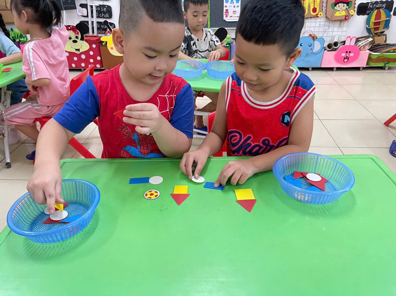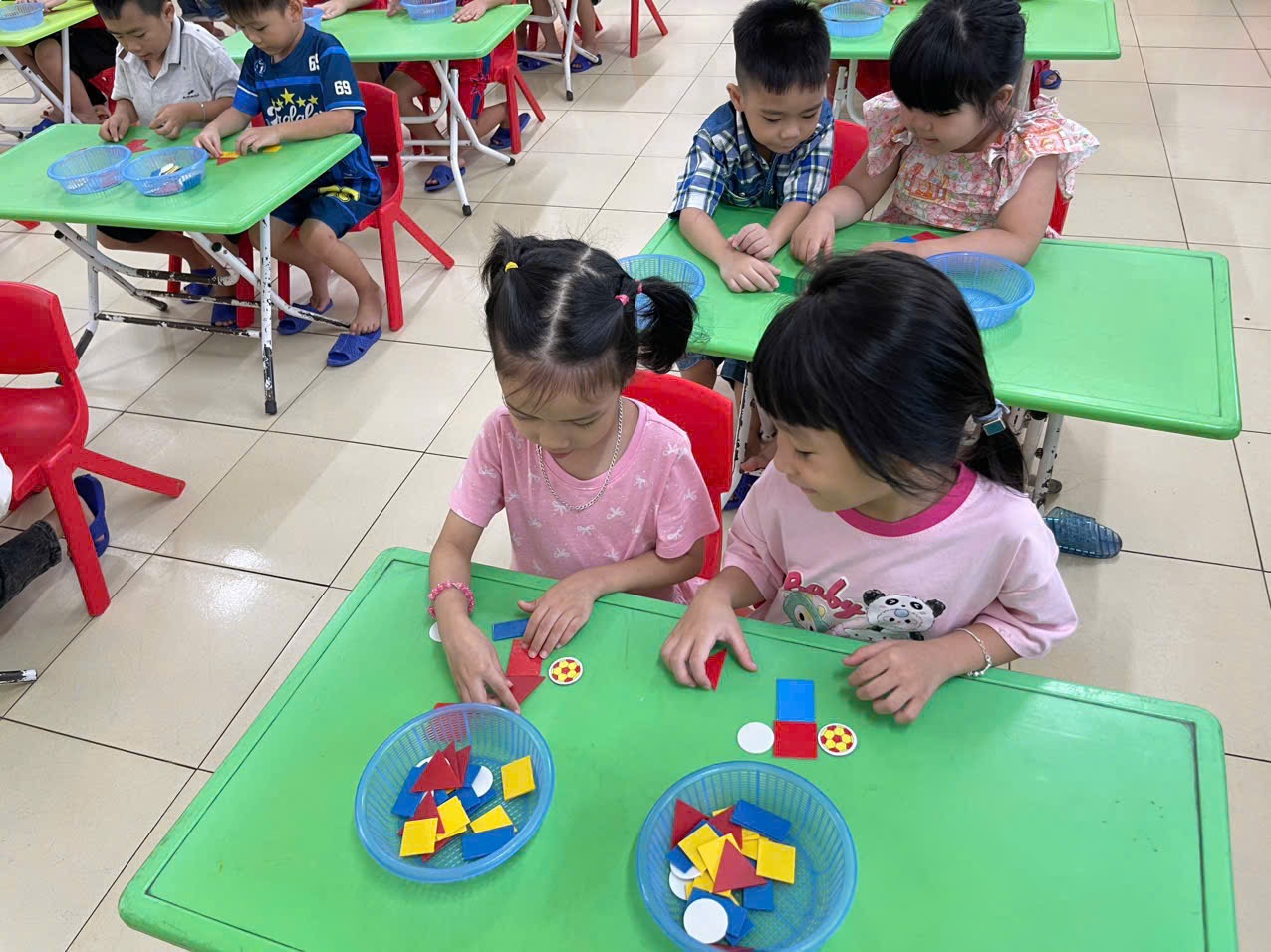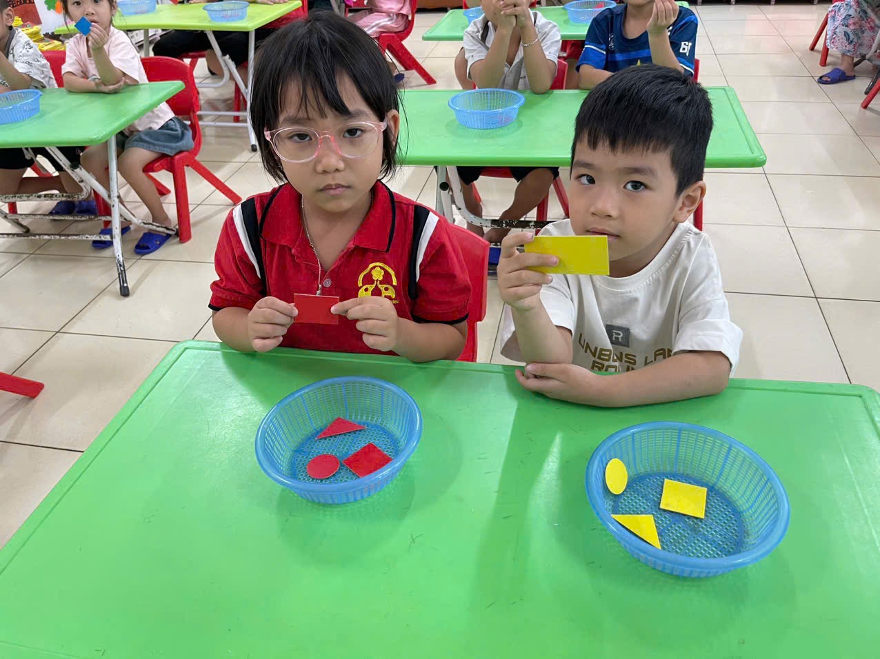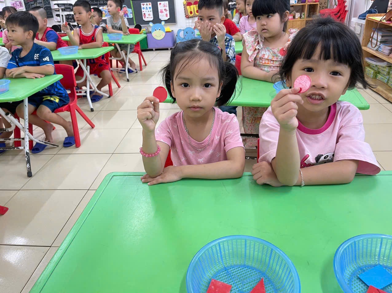 Thông qua hoạt động không chỉ giúp trẻ nhận biết và gọi đúng tên, biết đặc điểm của các hình cơ bản, biết phân biệt và so sánh các hình khác nhau theo đặc điểm, kích thước, màu sắc… mà còn giúp trẻ có kỹ năng