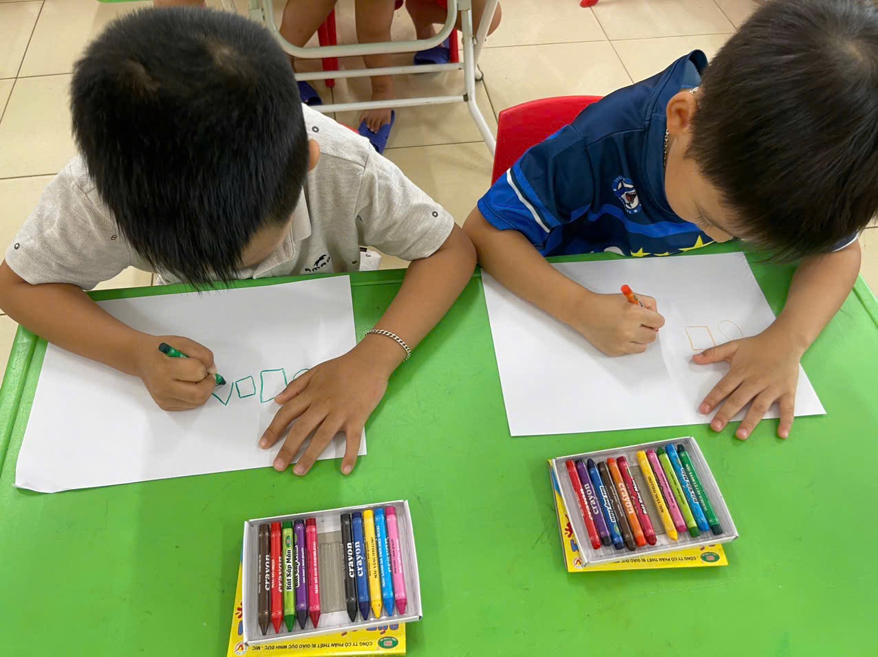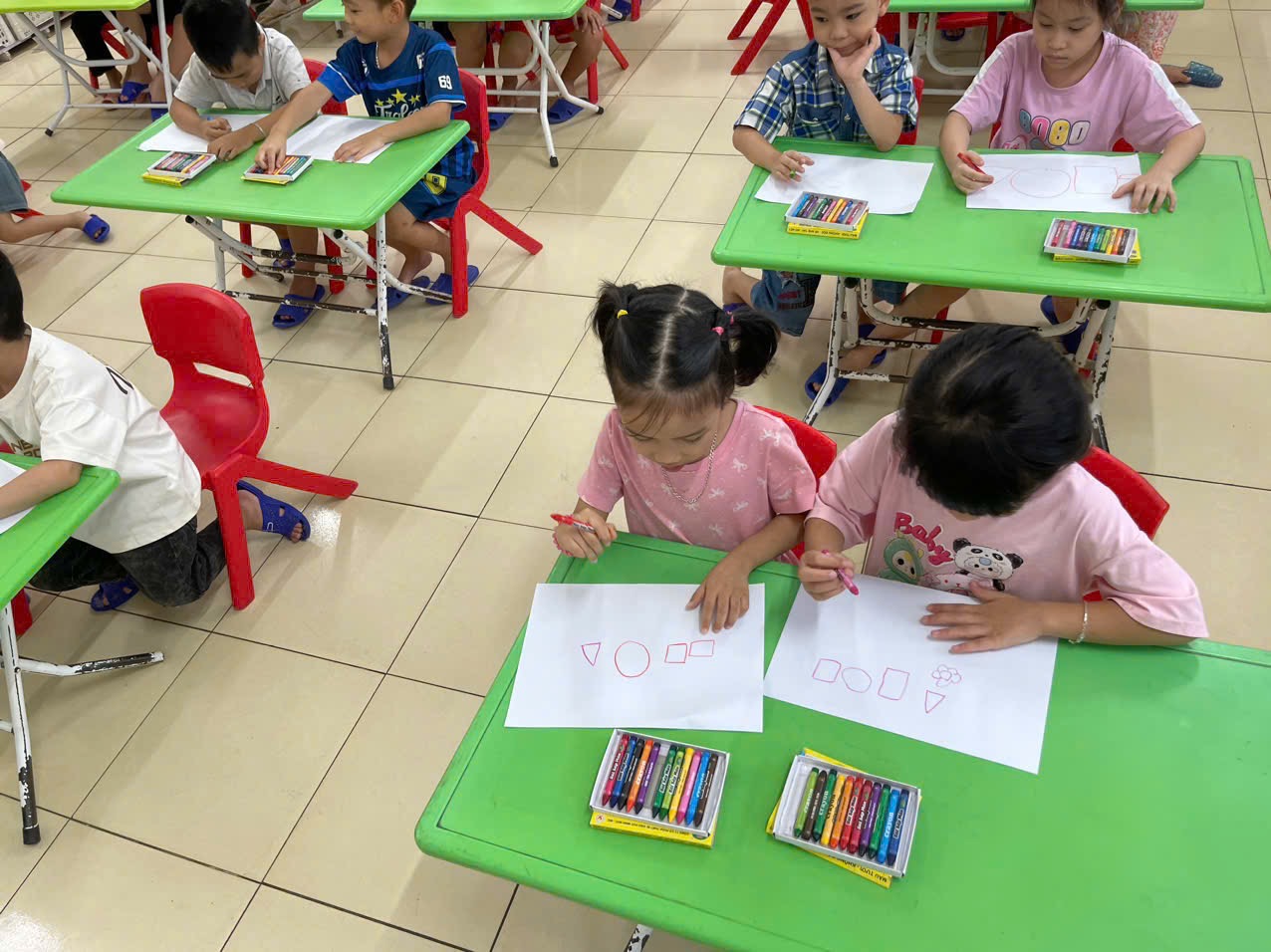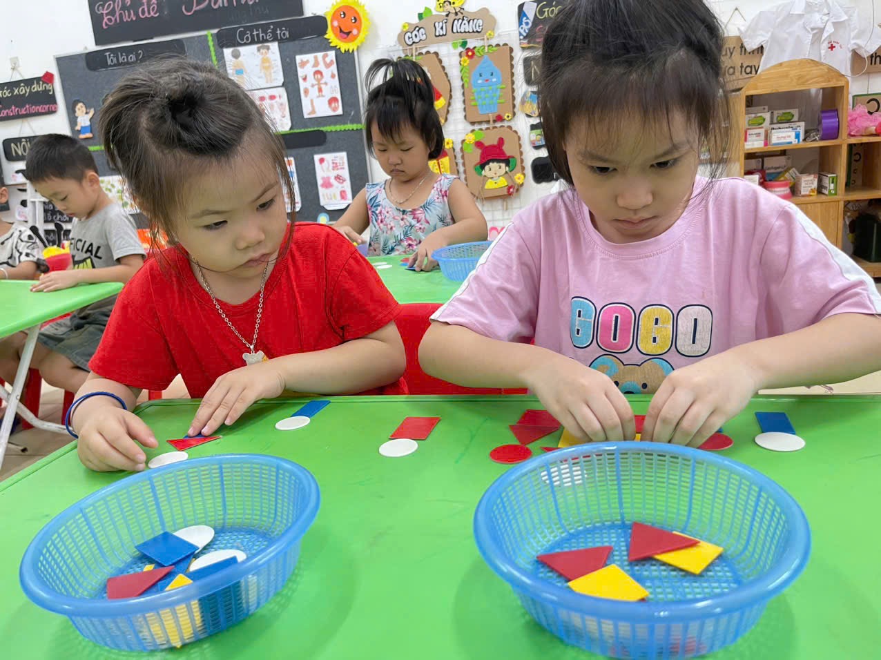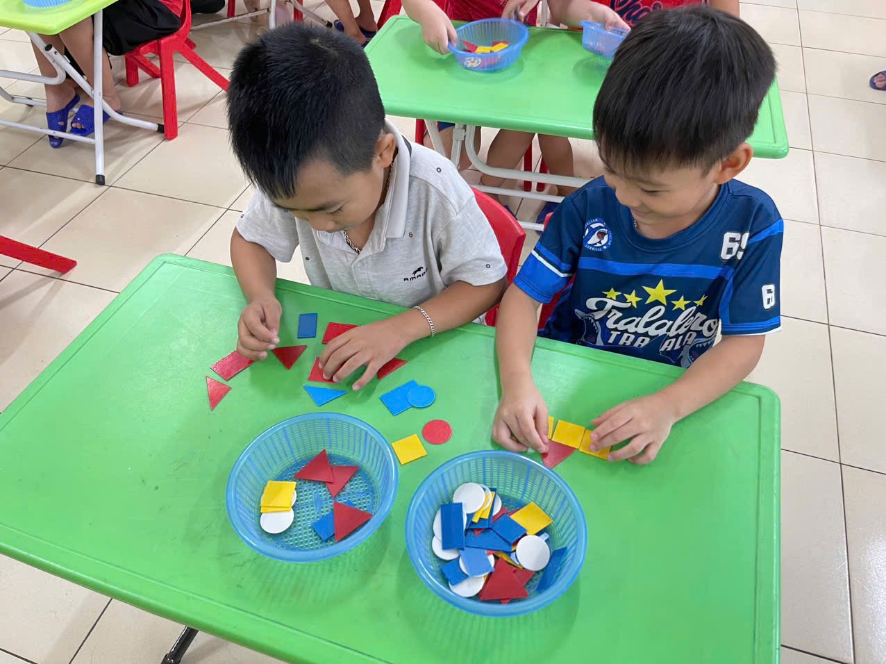 Thông qua hoạt động không chỉ giúp trẻ nhận biết và gọi đúng tên, biết đặc điểm của các hình cơ bản, biết phân biệt và so sánh các hình khác nhau theo đặc điểm, kích thước, màu sắc… mà còn giúp trẻ có kỹ năng