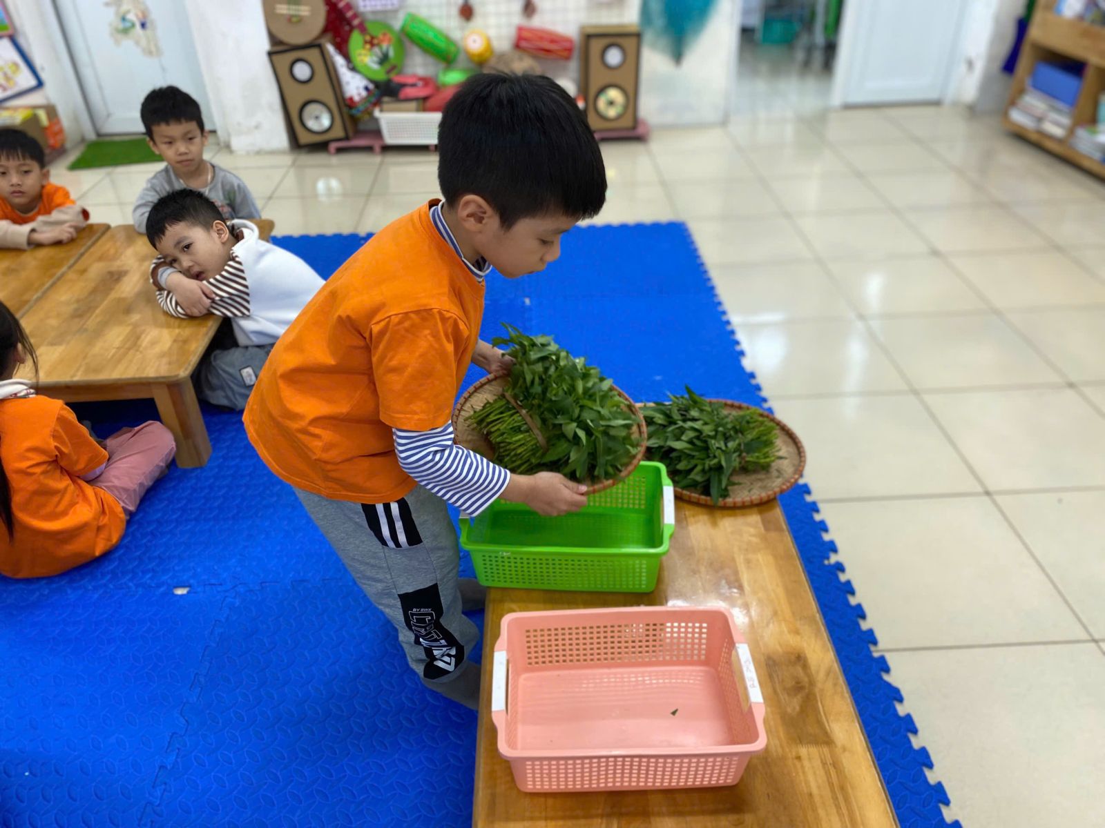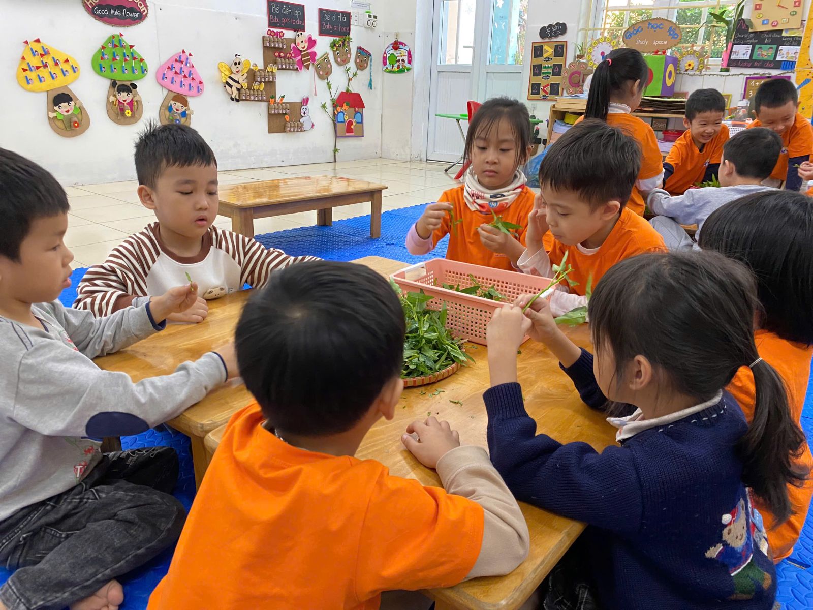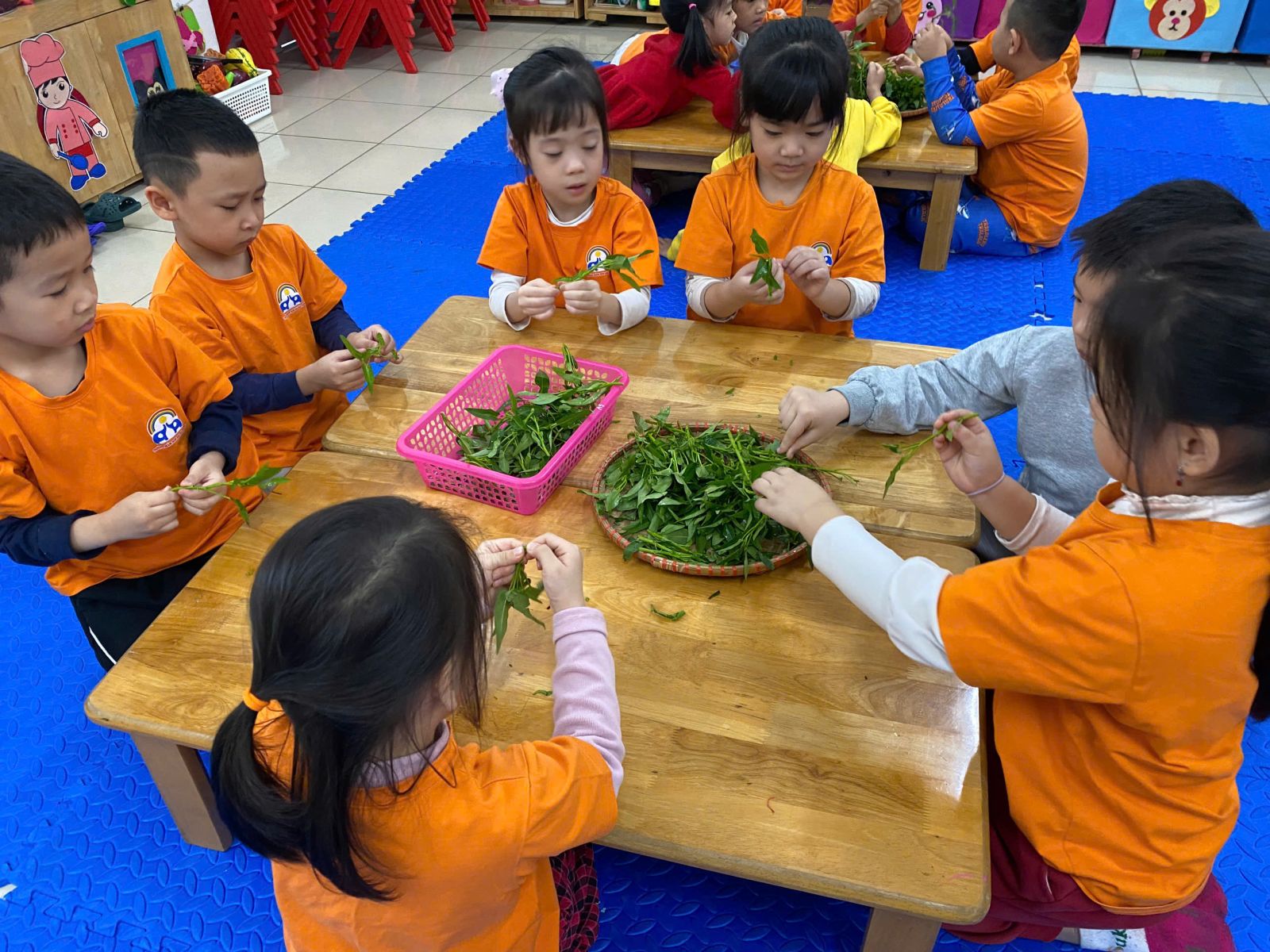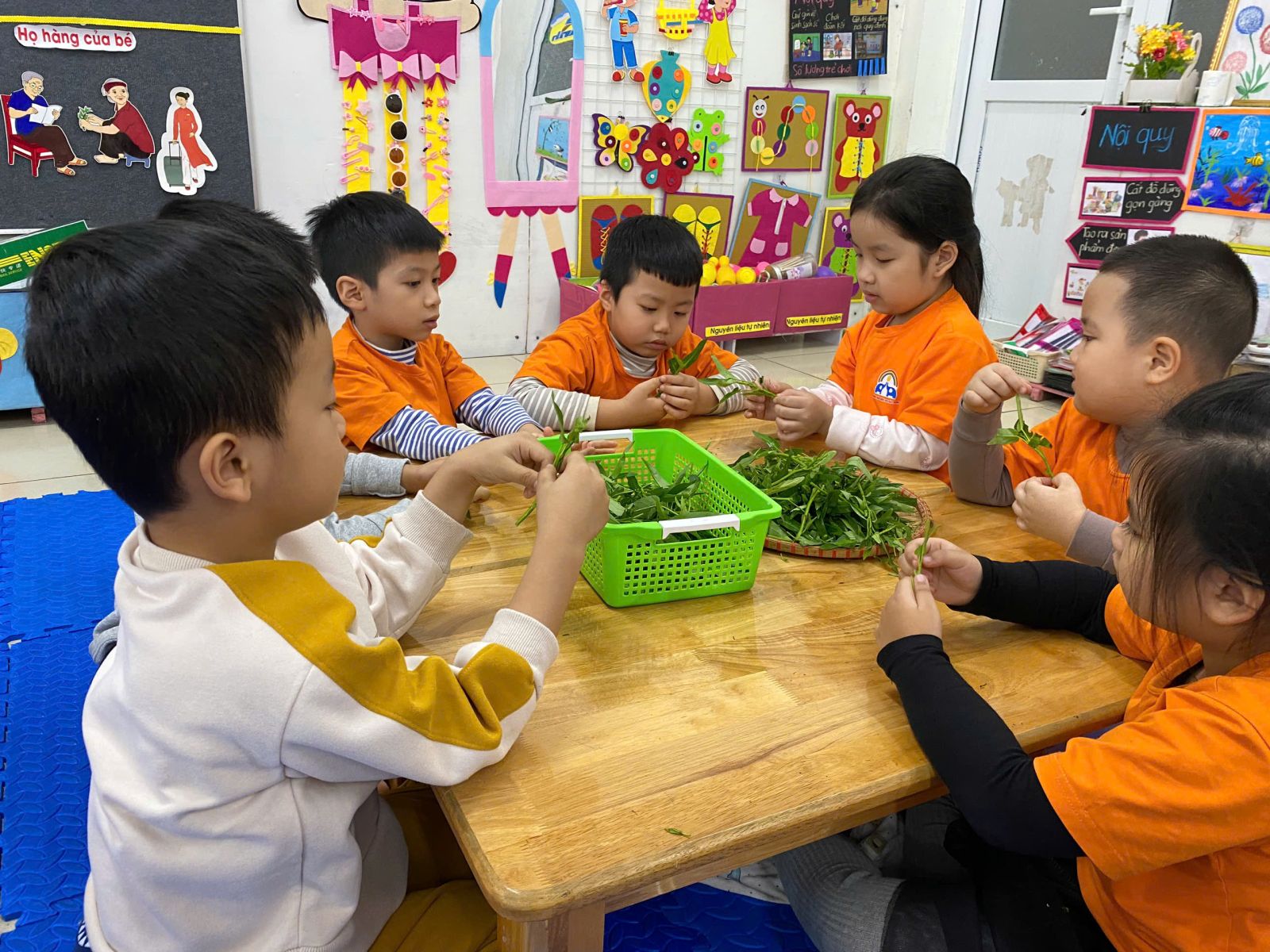 HOẠT ĐỘNG TRẢI NGHIỆM: NHẶT RAU MUỐNG. Hôm nay các con lớp A5 đã cùng nhau trải nghiệm nhặt rau muống vô cùng hào hứng. Thông qua hoạt động này các con nhận biết được đặc điểm của rau muống, biết rau muống chứa nhiều vitamin và muối khoáng rất tốt cho cơ thể. Dưới sự hướng dẫn của cô giáo, các con đã biết nhặt rau đúng cách, phân biệt được phần rau non ăn được và nhặt bỏ phần lá vàng úa, phần cuống già. Hoạt động này đã giáo dục các con biết chia