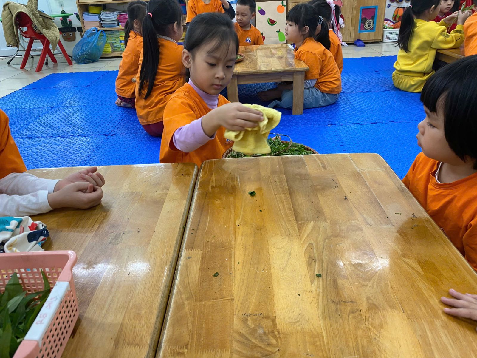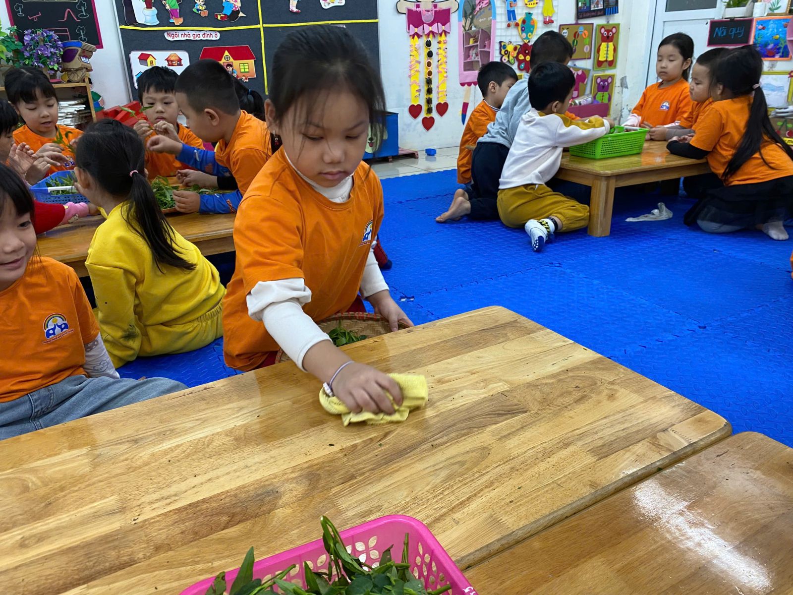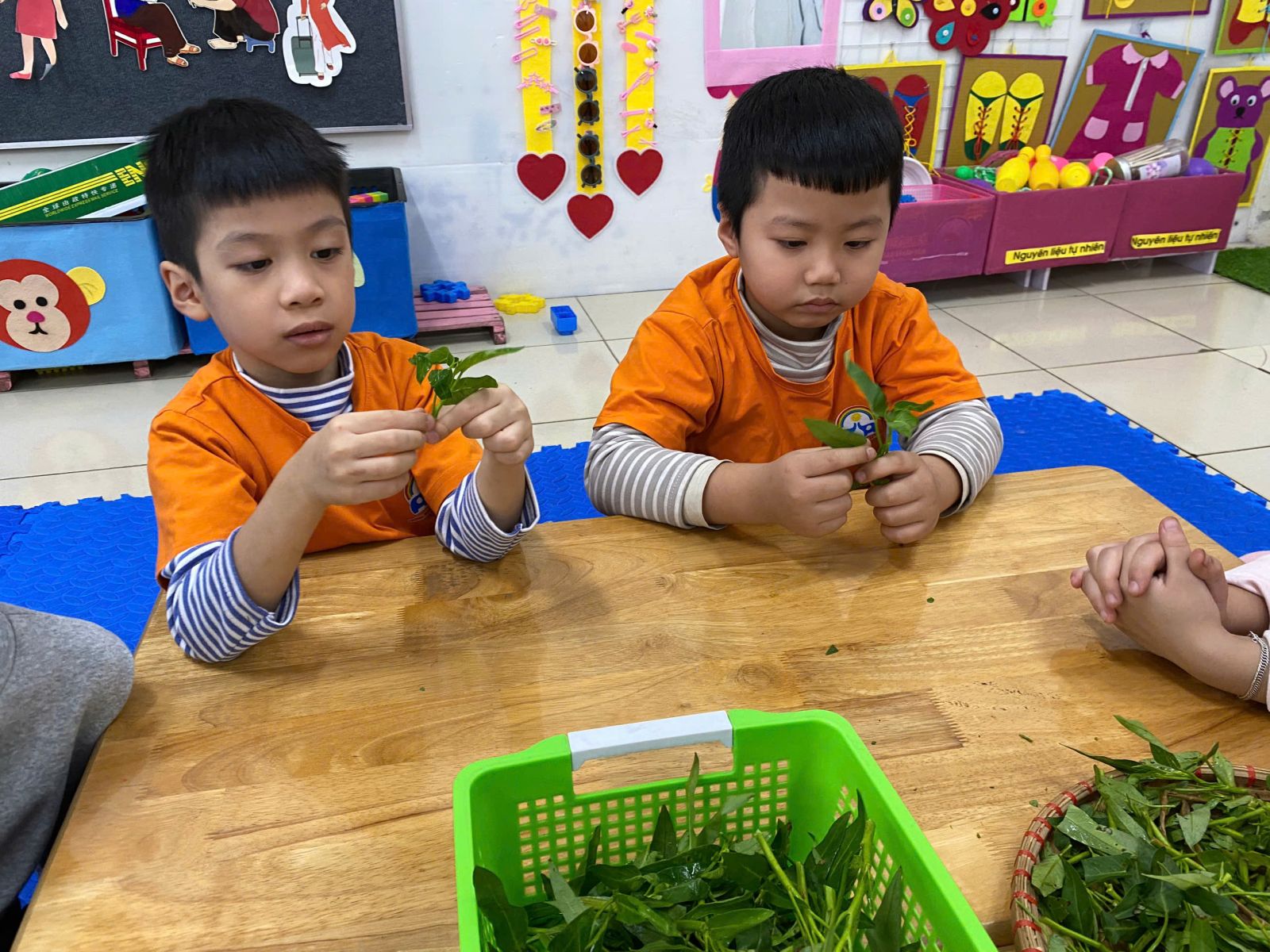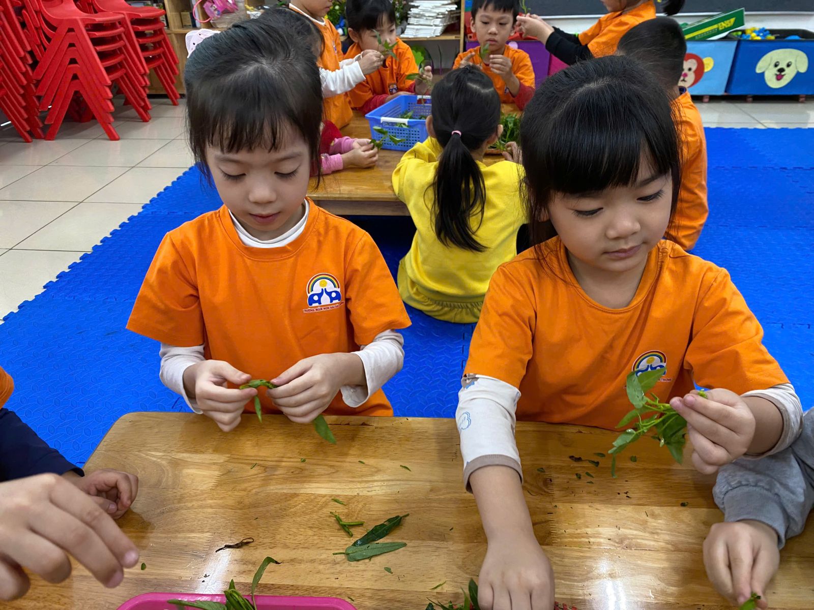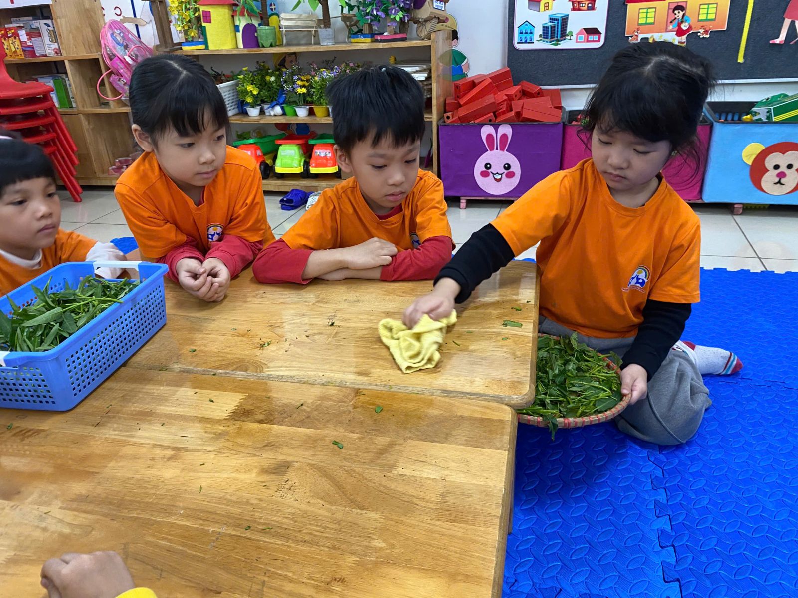 HOẠT ĐỘNG TRẢI NGHIỆM: NHẶT RAU MUỐNG. Hôm nay các con lớp A5 đã cùng nhau trải nghiệm nhặt rau muống vô cùng hào hứng. Thông qua hoạt động này các con nhận biết được đặc điểm của rau muống, biết rau muống chứa nhiều vitamin và muối khoáng rất tốt cho cơ thể. Dưới sự hướng dẫn của cô giáo, các con đã biết nhặt rau đúng cách, phân biệt được phần rau non ăn được và nhặt bỏ phần lá vàng úa, phần cuống già. Hoạt động này đã giáo dục các con biết chia