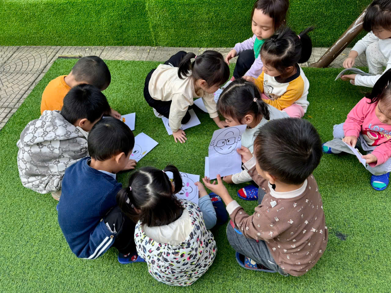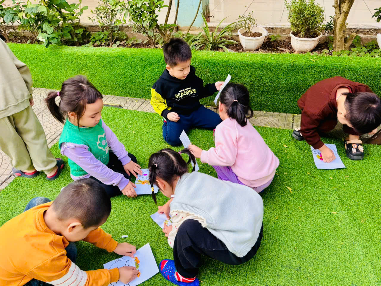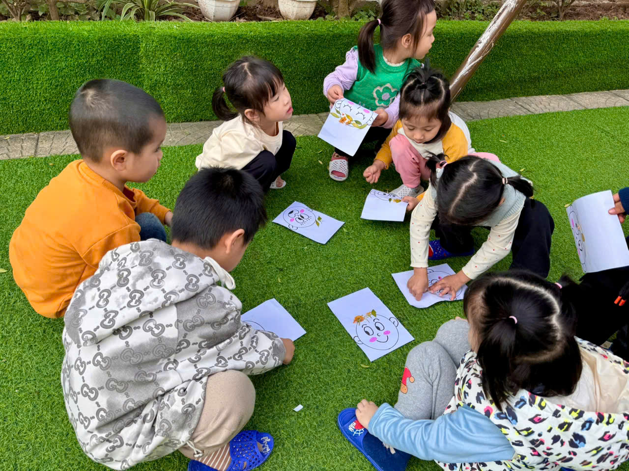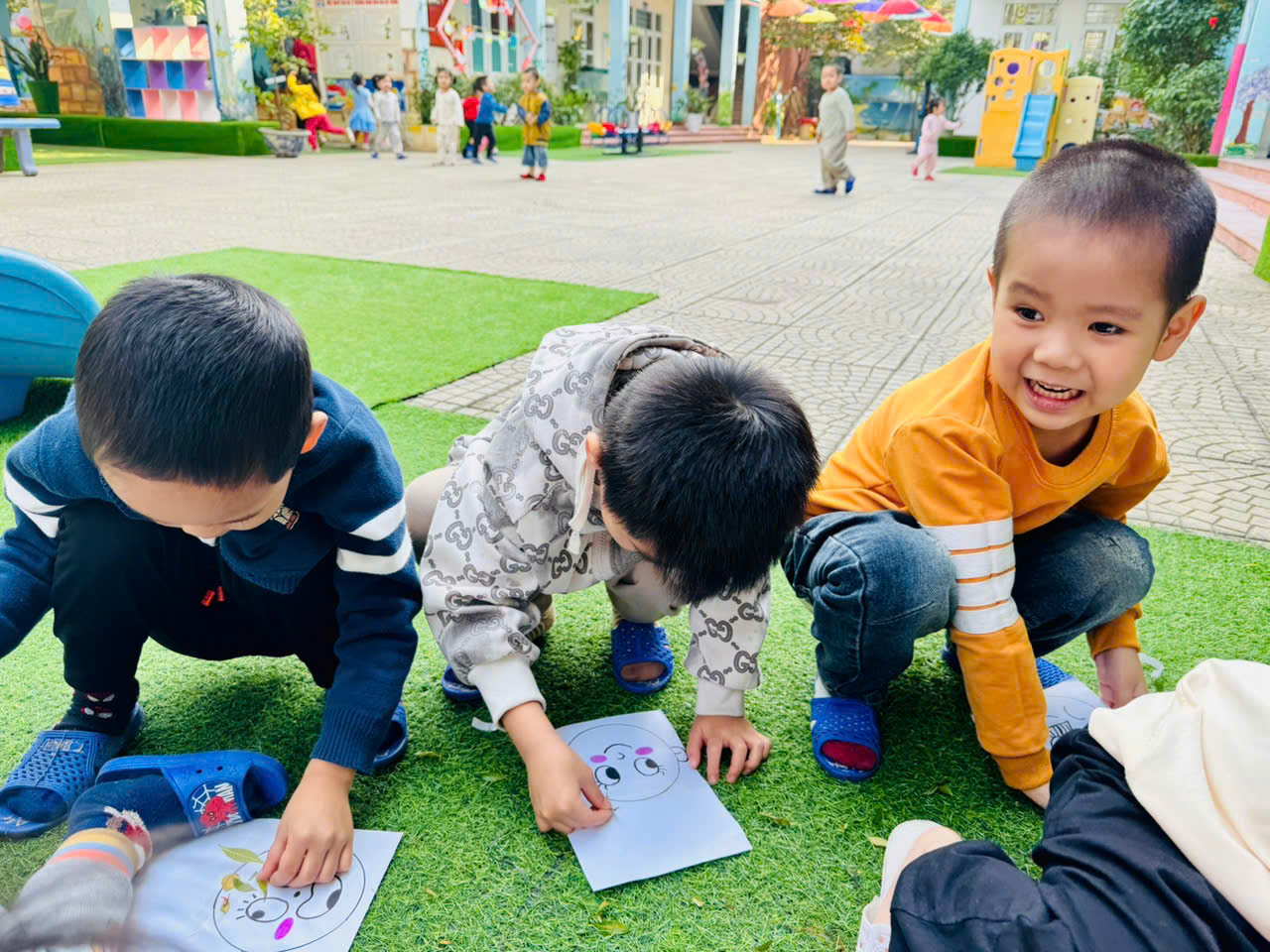 Hôm nay nắng đẹp. 🌸Đàn chim ri chim chích lớp A4 đc ra sân chơi động ngoài trời “nhặt lá vàng trang trí sáng tạo những thành viên trong gia đình “. 🌻Phát triển óc thẩm mỹ, khả năng sáng tạo cho trẻ.🌹 Đặc b