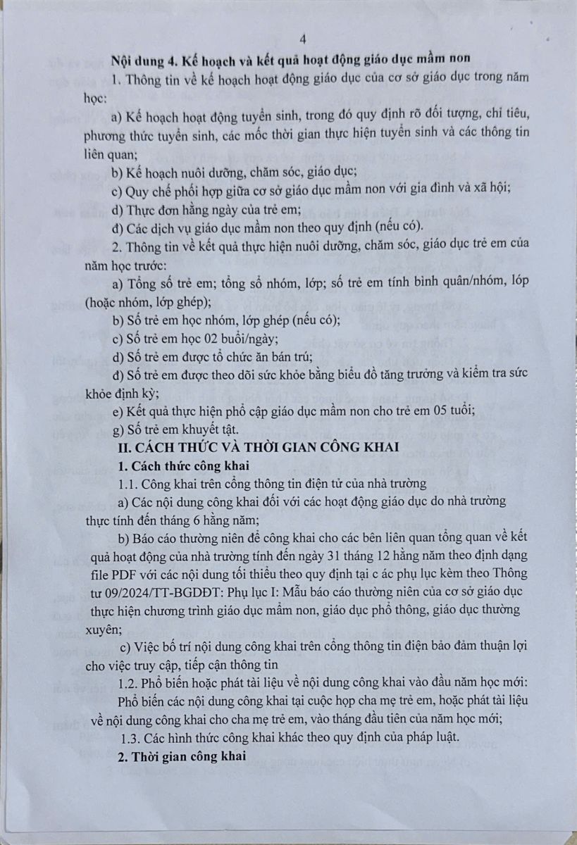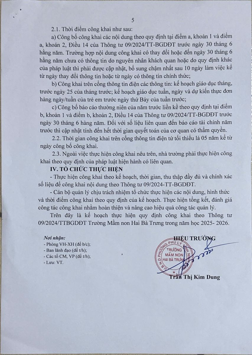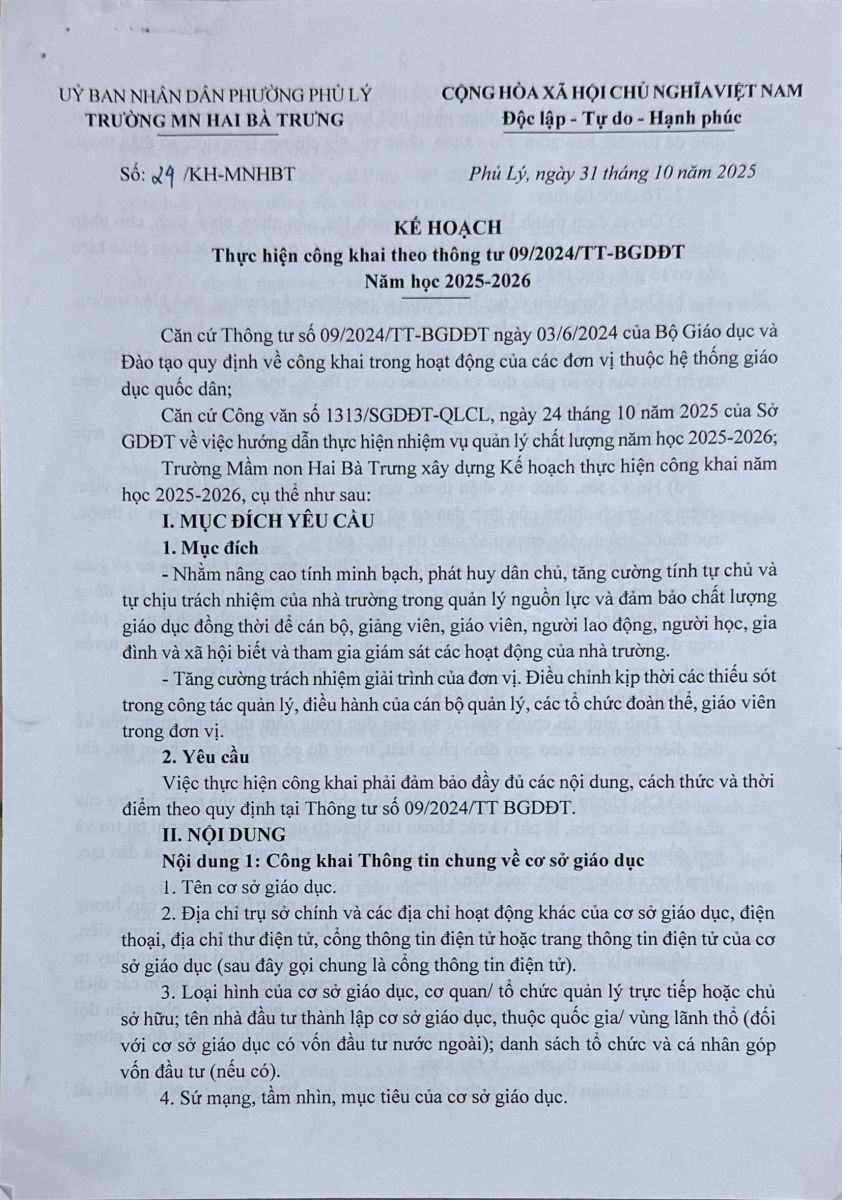 Kế hoạch thực hiện công khai theo thông tư 09/2024/TT-BGDĐT năm học 2025-2026