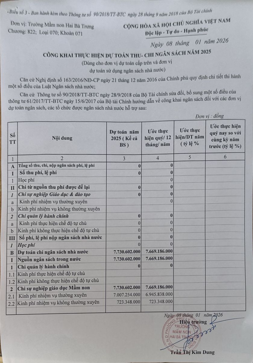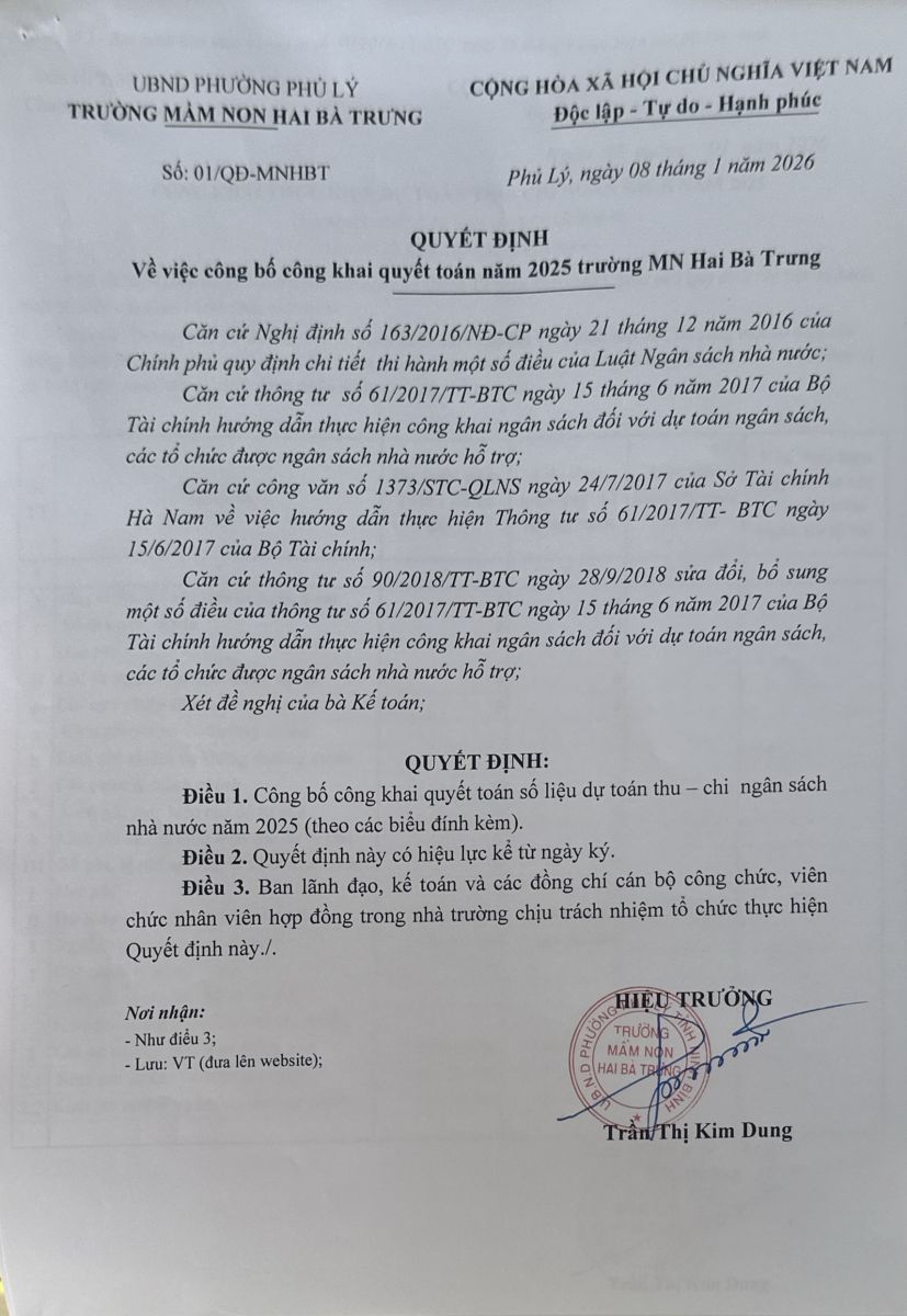 Quyết định về việc công bố, công khai quyết toán năm 2025 trường mầm non Hai Bà Trưng