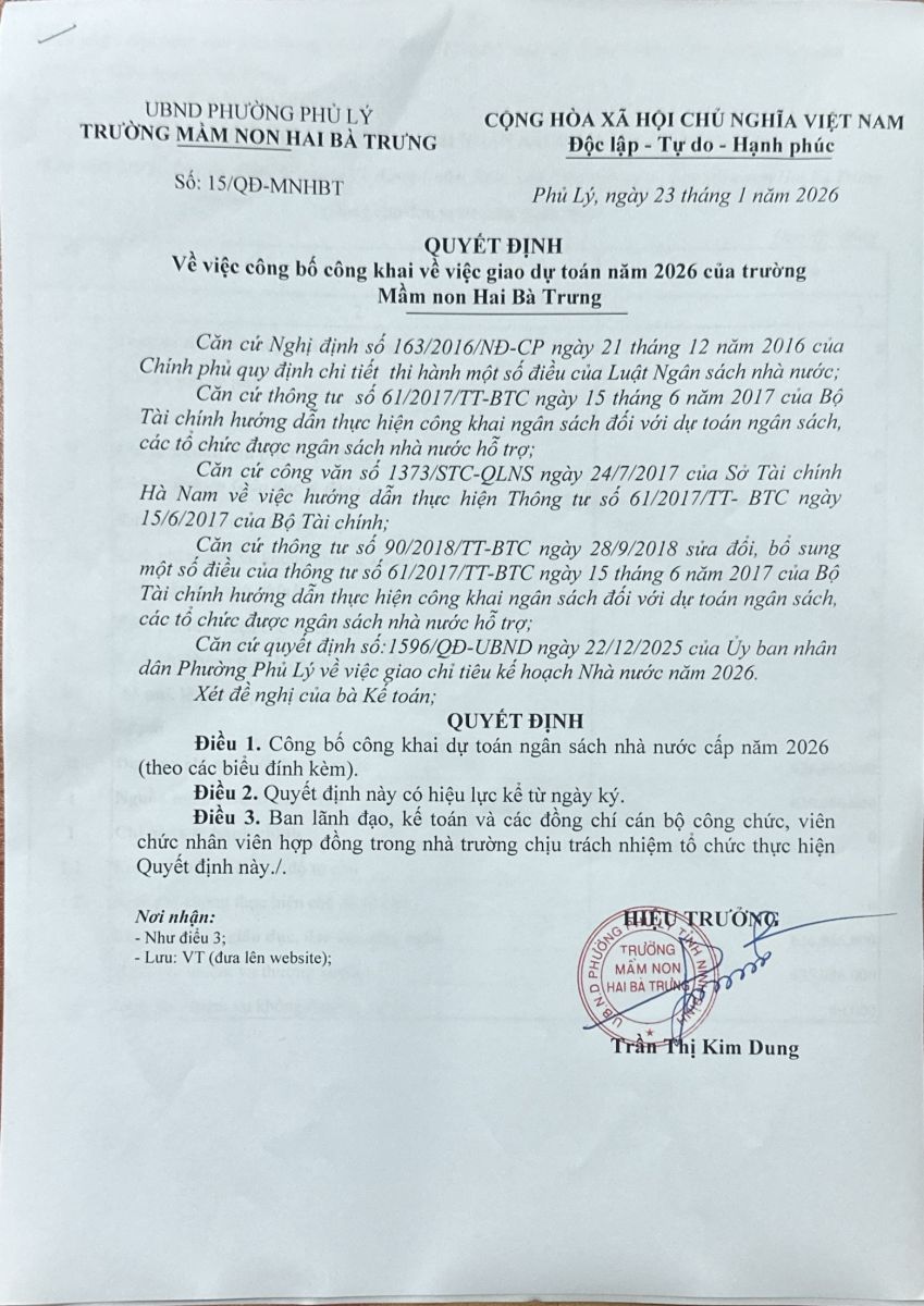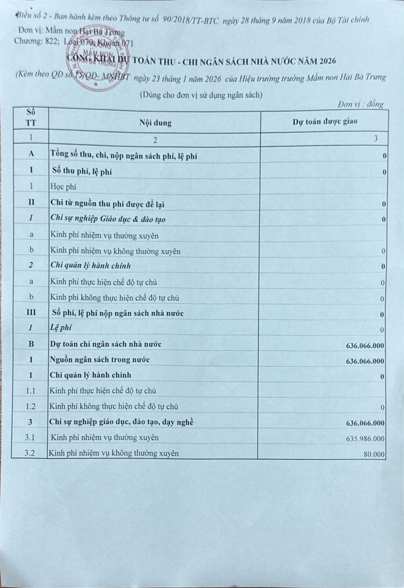 Quyết định về việc công bố công khai về việc giao dự toán năm 2026 của trường mầm non Hai Bà Trưng