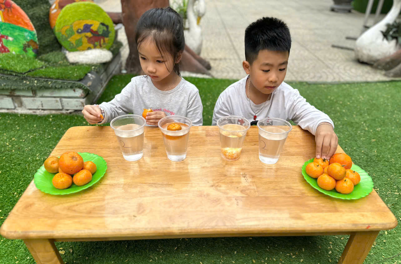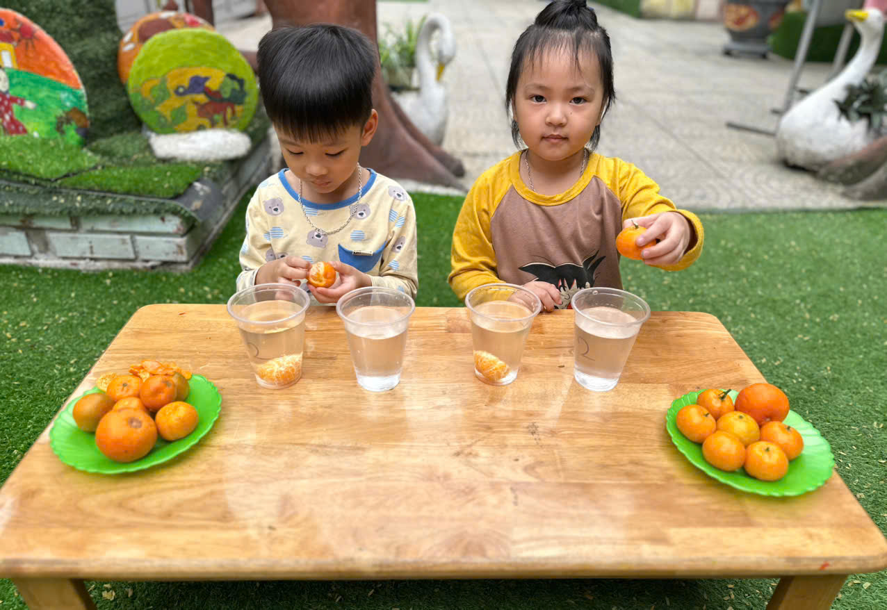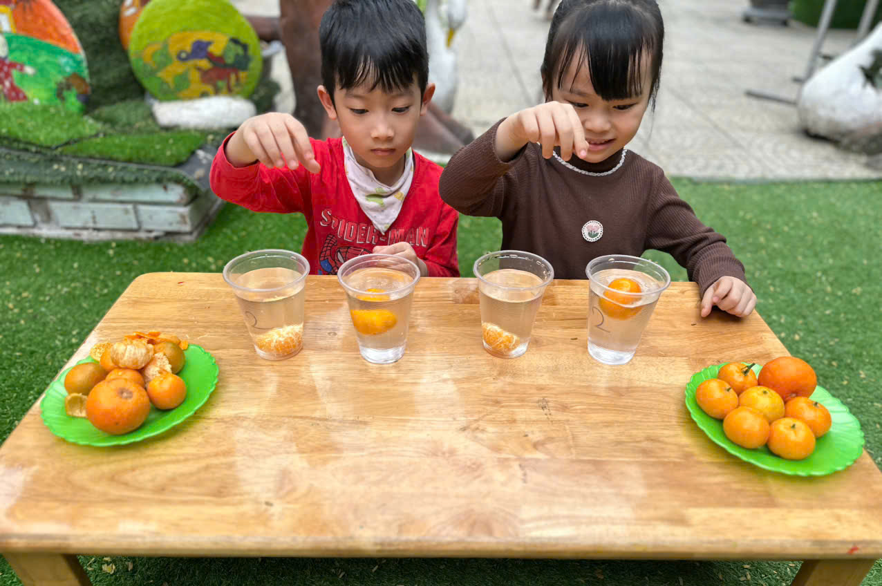 Khi còn vỏ thì quýt nổi, bóc vỏ ra lại chìm xuống thật bất ngờ phải không??? Chỉ từ một quả quýt và cốc nước, các bạn nhỏ đã được học cách quan sát, đặt câu hỏi và khám phá khoa học thật vui. Vừa học vừa chơi hãy cùng ngắm nhìn những hình ảnh của các bạn nhỏ lớp C5 tham gia vào hoạt động này nha.