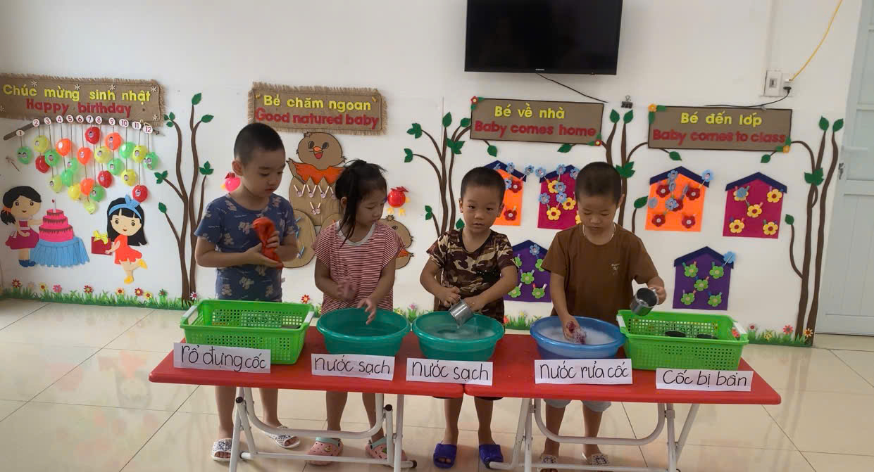 Tuổi nhỏ làm việc nhỏ tùy theo sức của mình. Các búp măng non lớp D4 hôm nay học được cách – làm sao rửa sạch một chiếc cốc đang bẩn ?