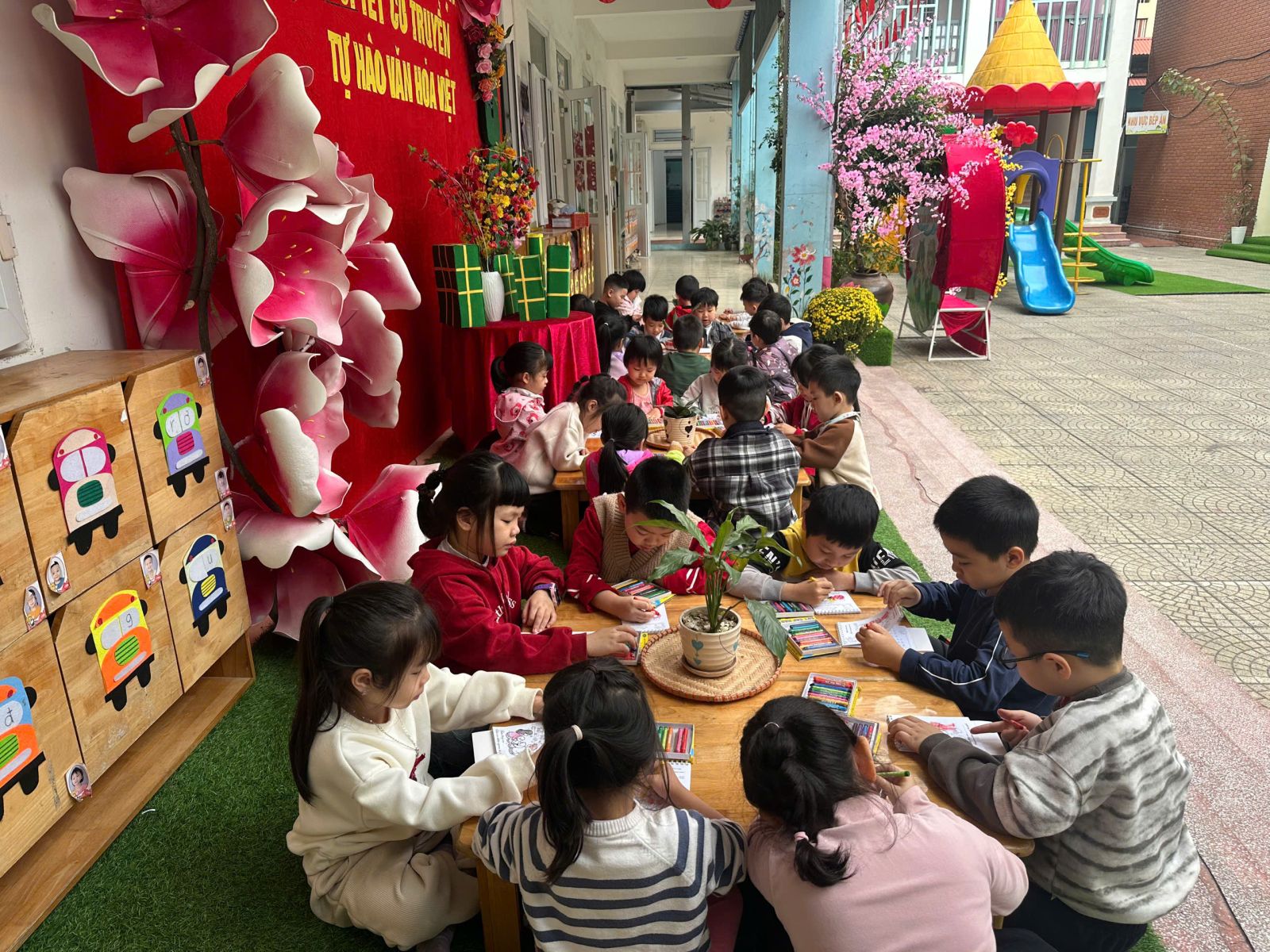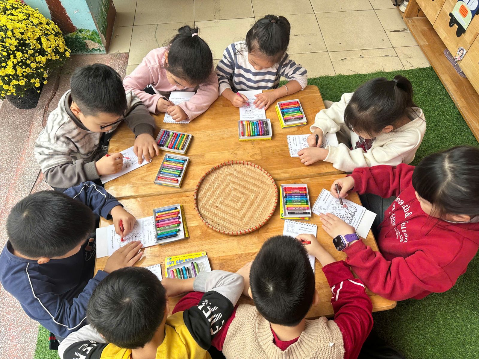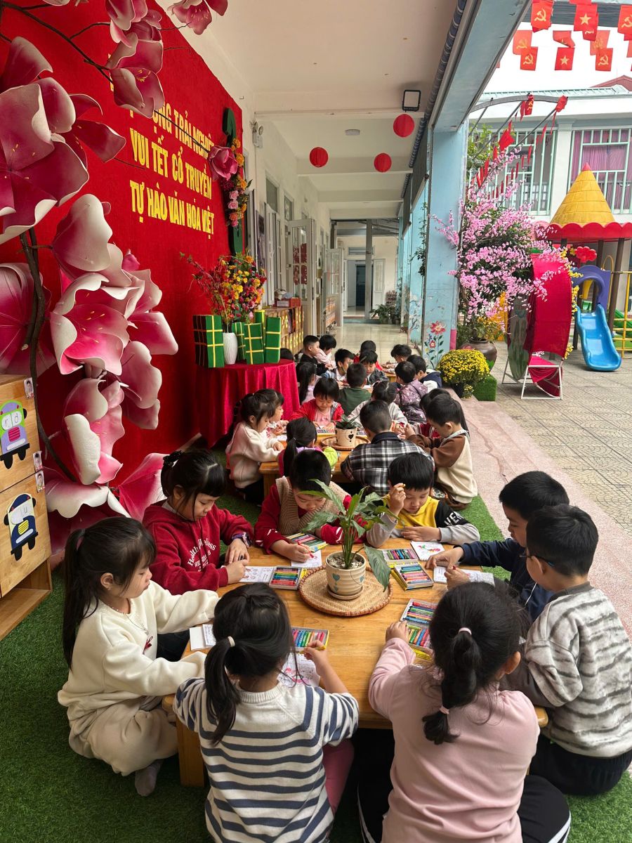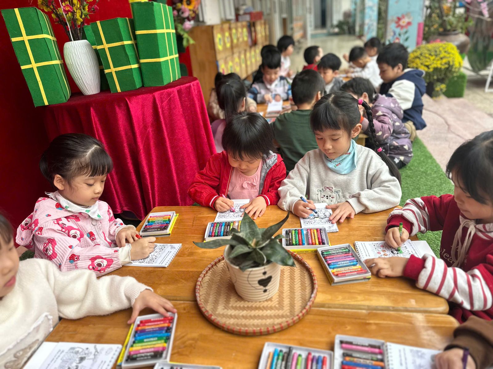 Hoạt động tô màu lịch Tết năm 2026 giúp trẻ hiểu về ngày Tết cổ truyền của dân tộc, biết Tết là thời điểm bắt đầu một năm mới, tạo cho trẻ cảm xúc vui tươi, háo hức đón xuân. • Thông qua việc tô màu các hình ảnh quen thuộc trong ngày Tết như hoa đào, hoa mai, bánh chưng, câu đối đỏ, trẻ được làm quen và ghi nhớ các nét đẹp văn hóa truyền thống, góp phần giáo dục tình yêu quê hương, đất nước. Hoạt động tạo hình “ trang trí lịch tết 2026” của các con lớp B5 mời các cô cùng các bạn đó