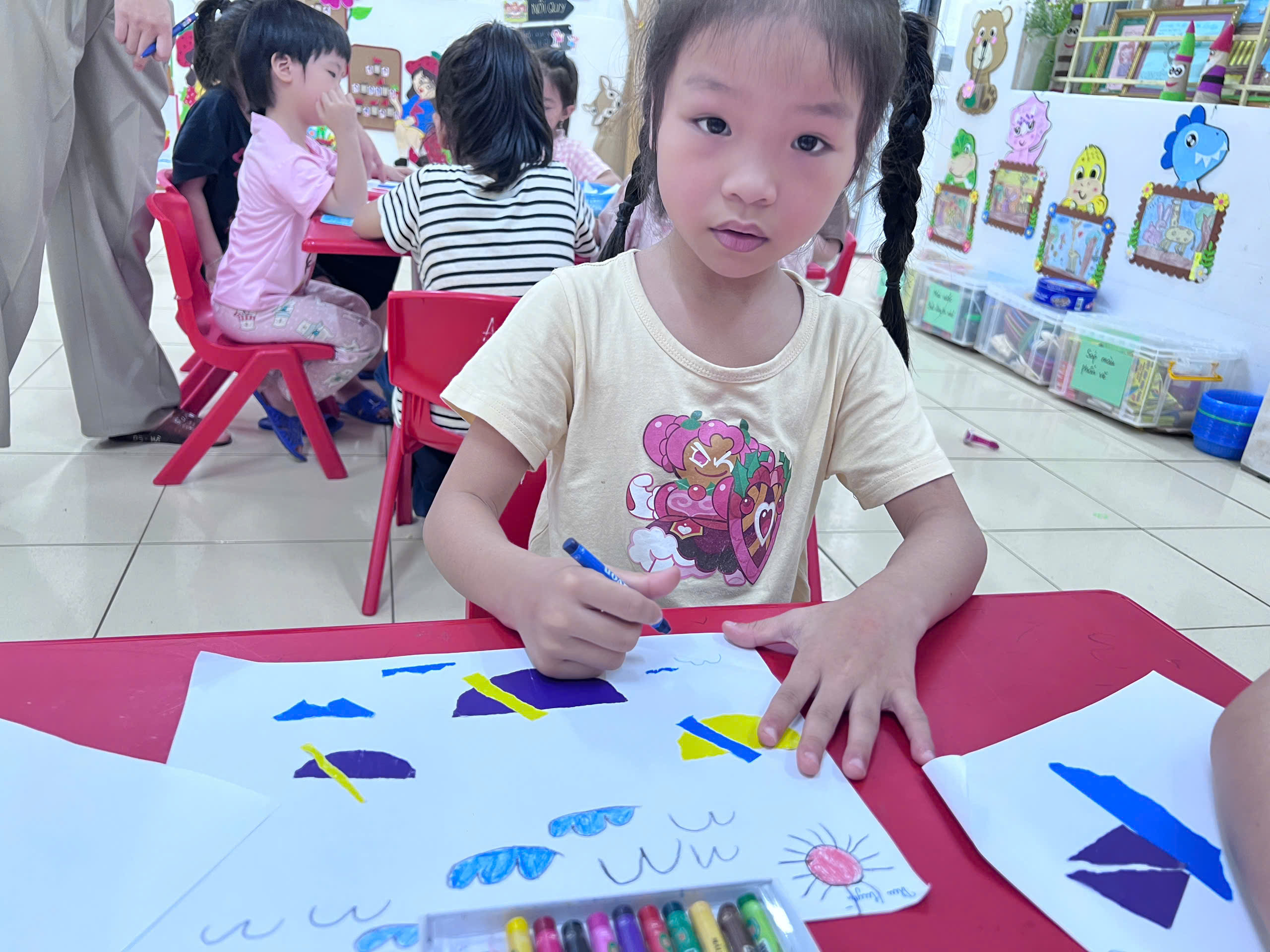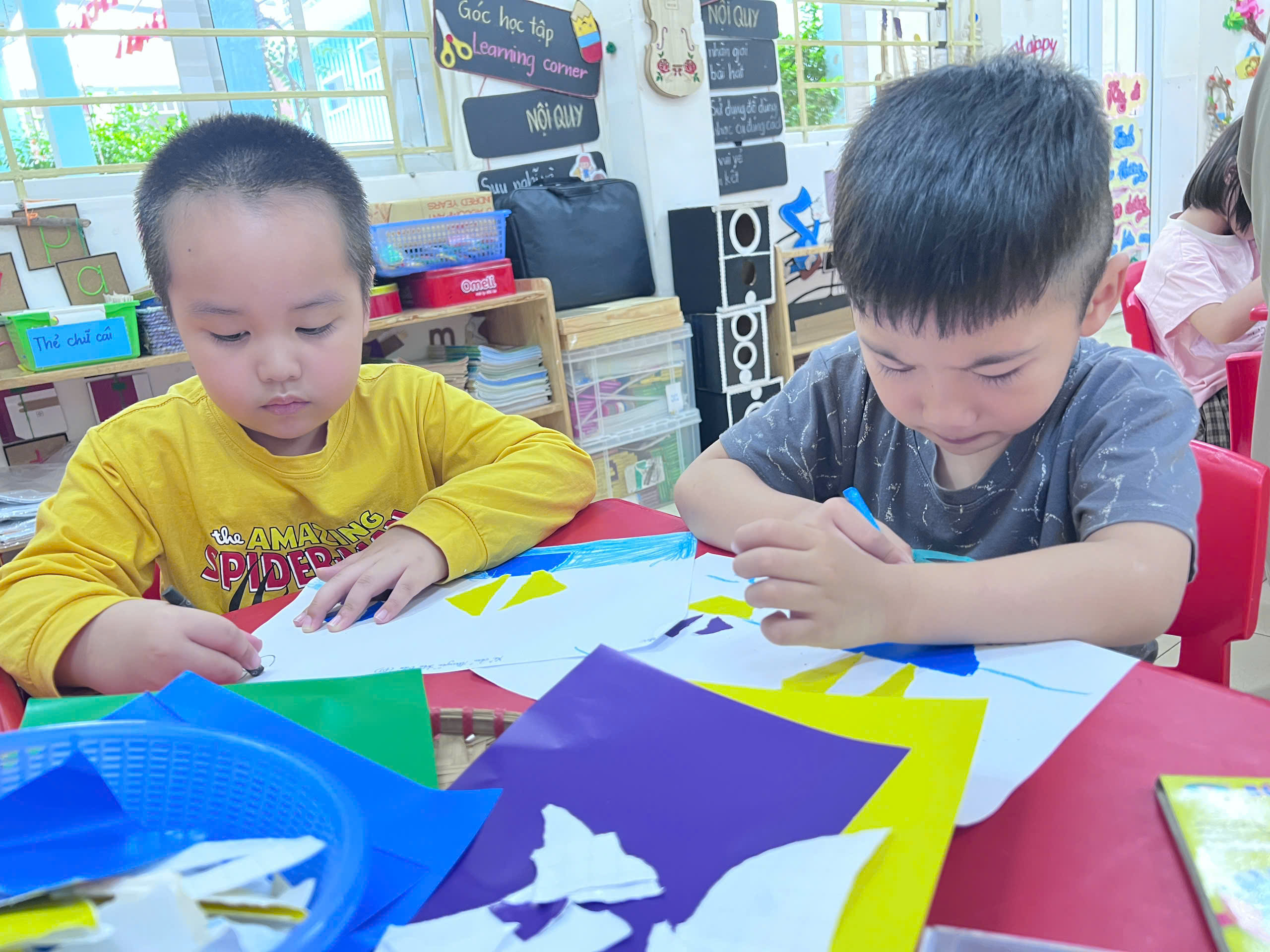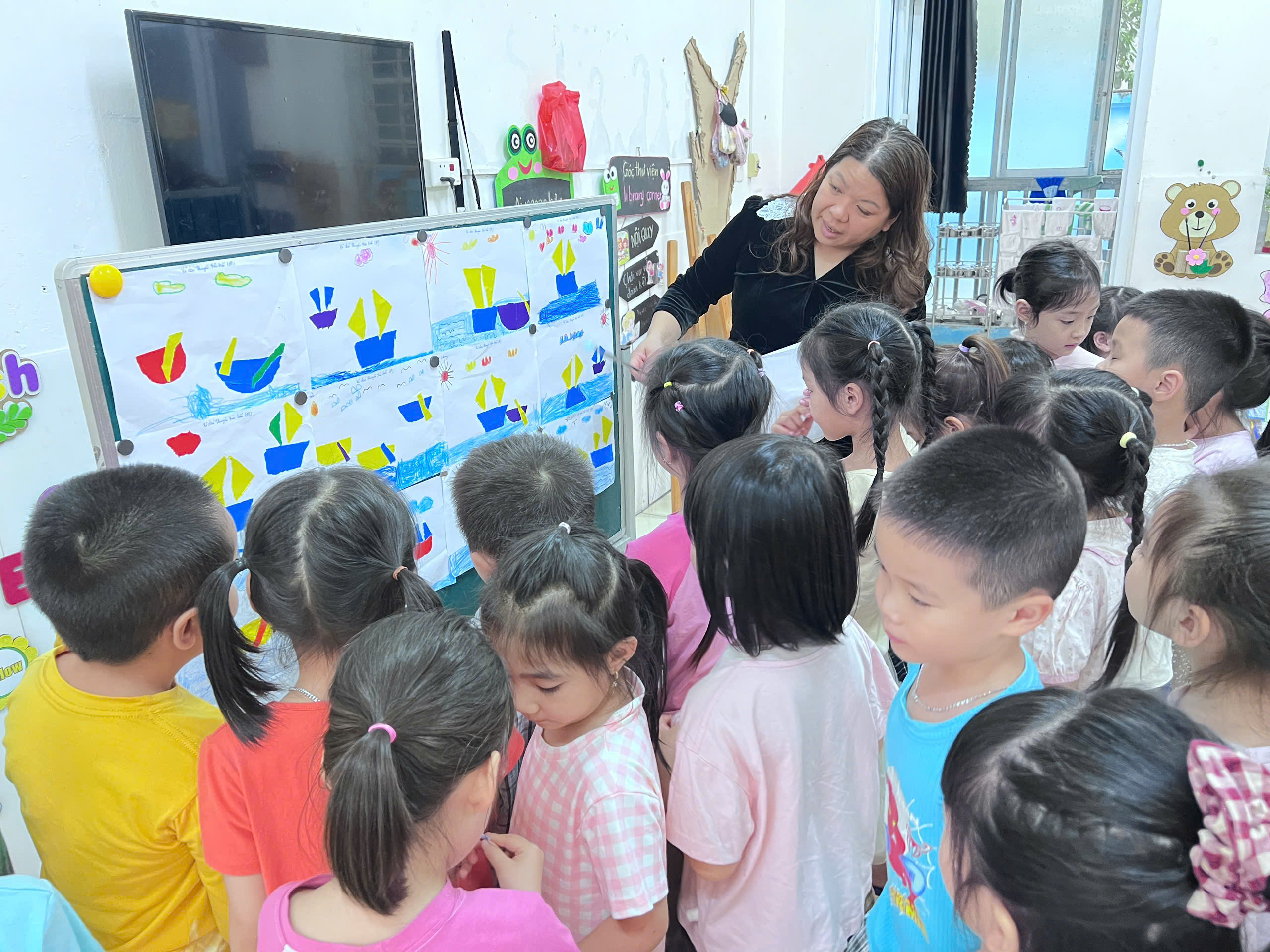 🎨✂️ Với đôi bàn tay khéo léo và trí tưởng tượng phong phú, các con đã tự tay xé những mảnh giấy màu và dán thành những chiếc thuyền xinh xắn đang lênh đênh trên mặt biển xanh. Có bạn sáng tạo thêm ông mặt trời rực rỡ, có bạn lại vẽ thêm đám mấy, đàn cá tung tăng, hay những con sóng nhấp nhô thật sinh động. Bố mẹ cùng ngắm nhìn sản phầm của các con nhé ạ!